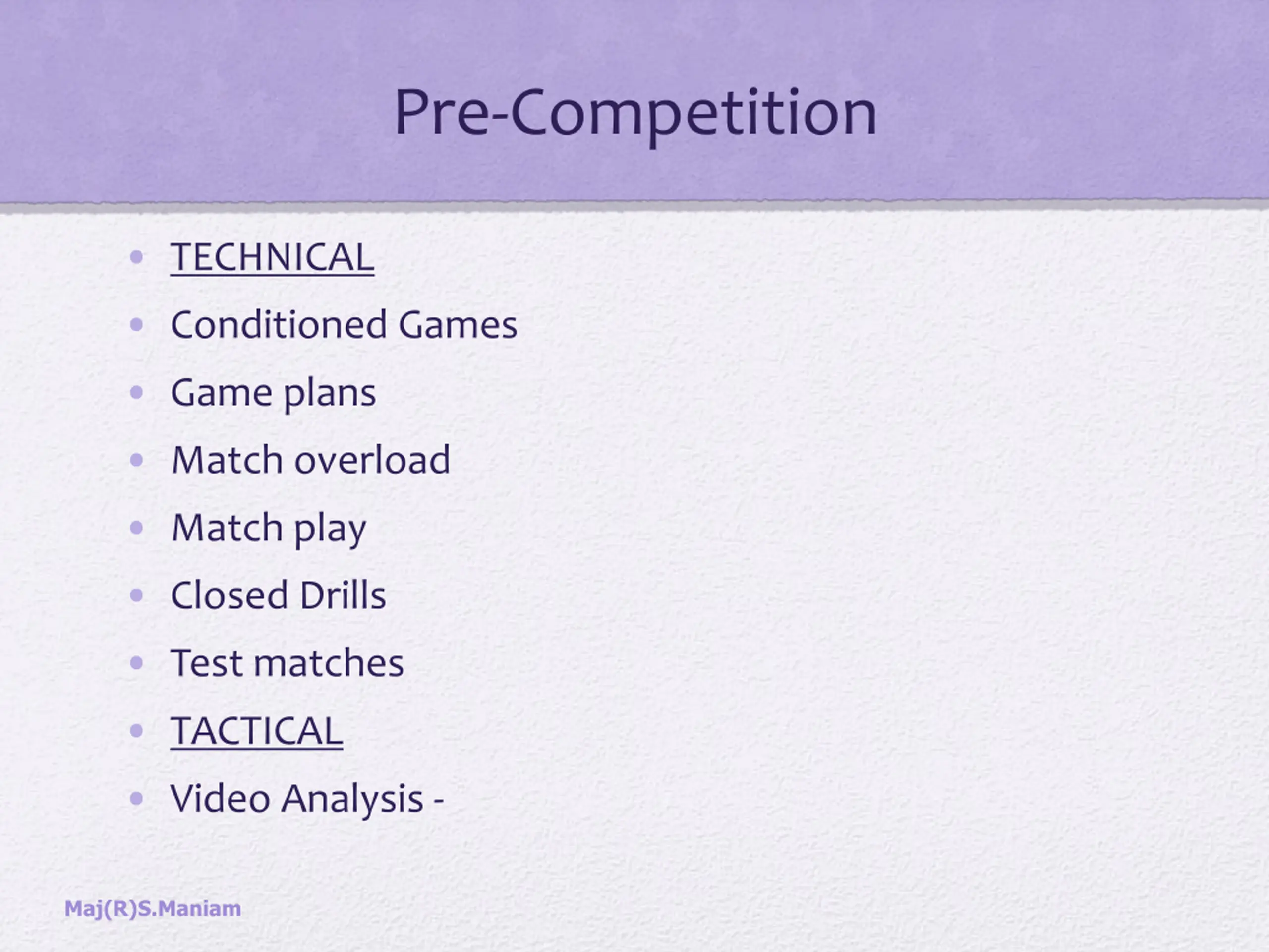 Pre-Competition TECHNICAL Conditioned Games Game plans Match overload Match play Closed Drills Test matches TACTICAL Video Analysis - Maj(R)S.Maniam