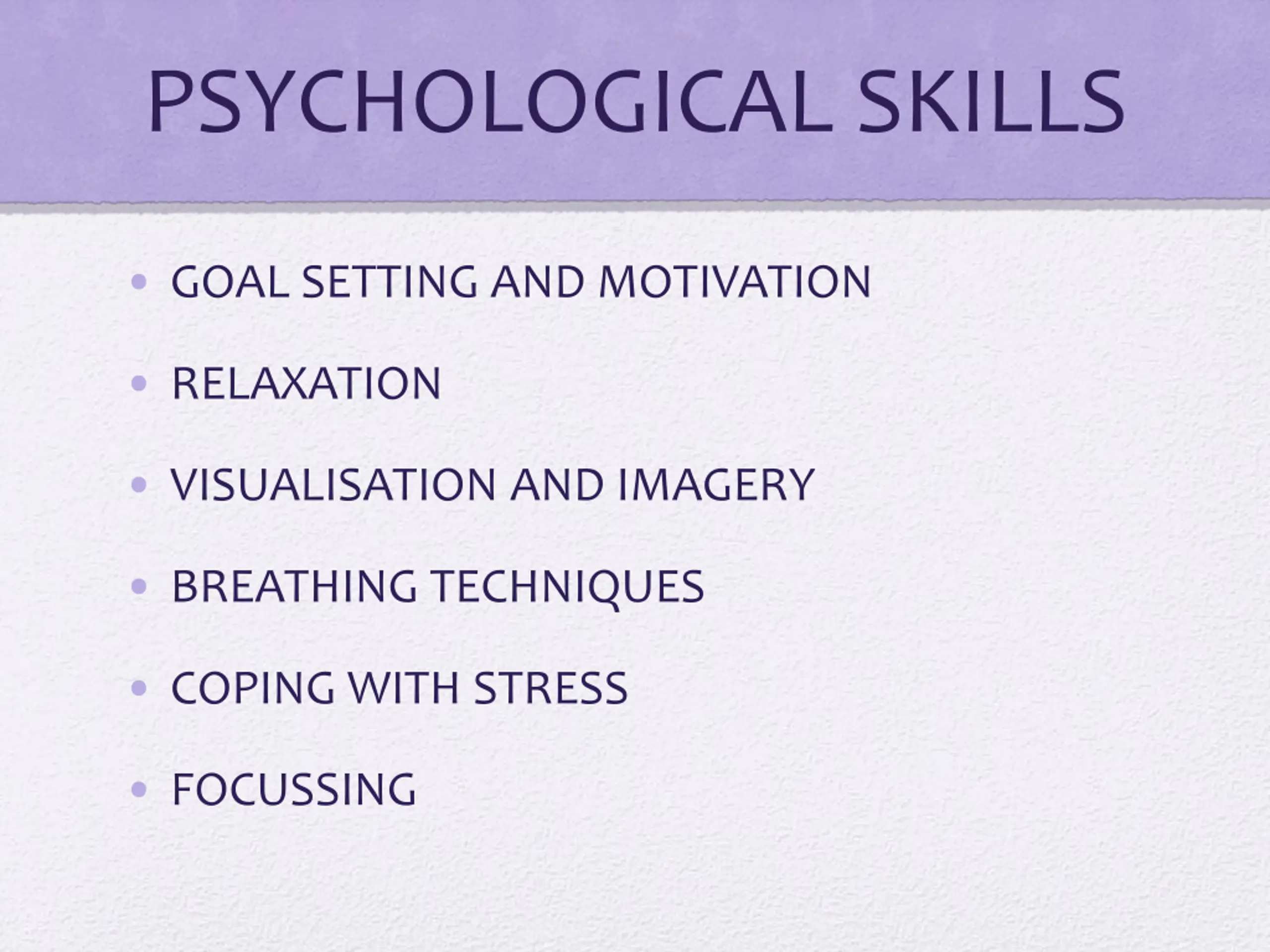 PSYCHOLOGICAL SKILLS GOAL SETTING AND MOTIVATION RELAXATION VISUALISATION AND IMAGERY BREATHING TECHNIQUES COPING WITH STRESS FOCUSSING