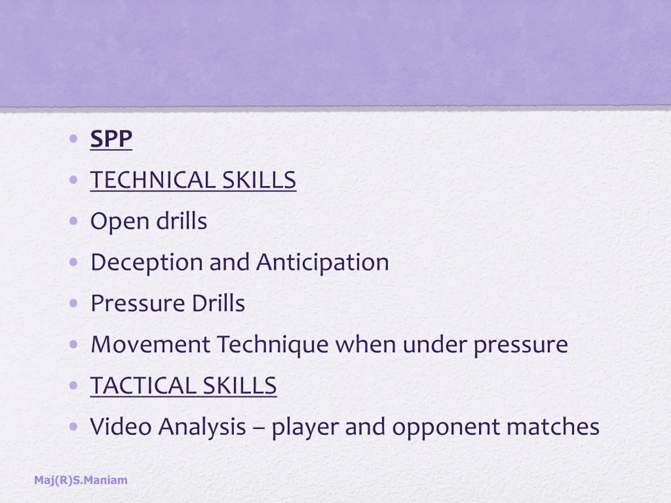 SPP TECHNICAL SKILLS Open drills Deception and Anticipation Pressure Drills Movement Technique when under pressure TACTICAL SKILLS Video Analysis player and opponent matches Maj(R)S.Maniam