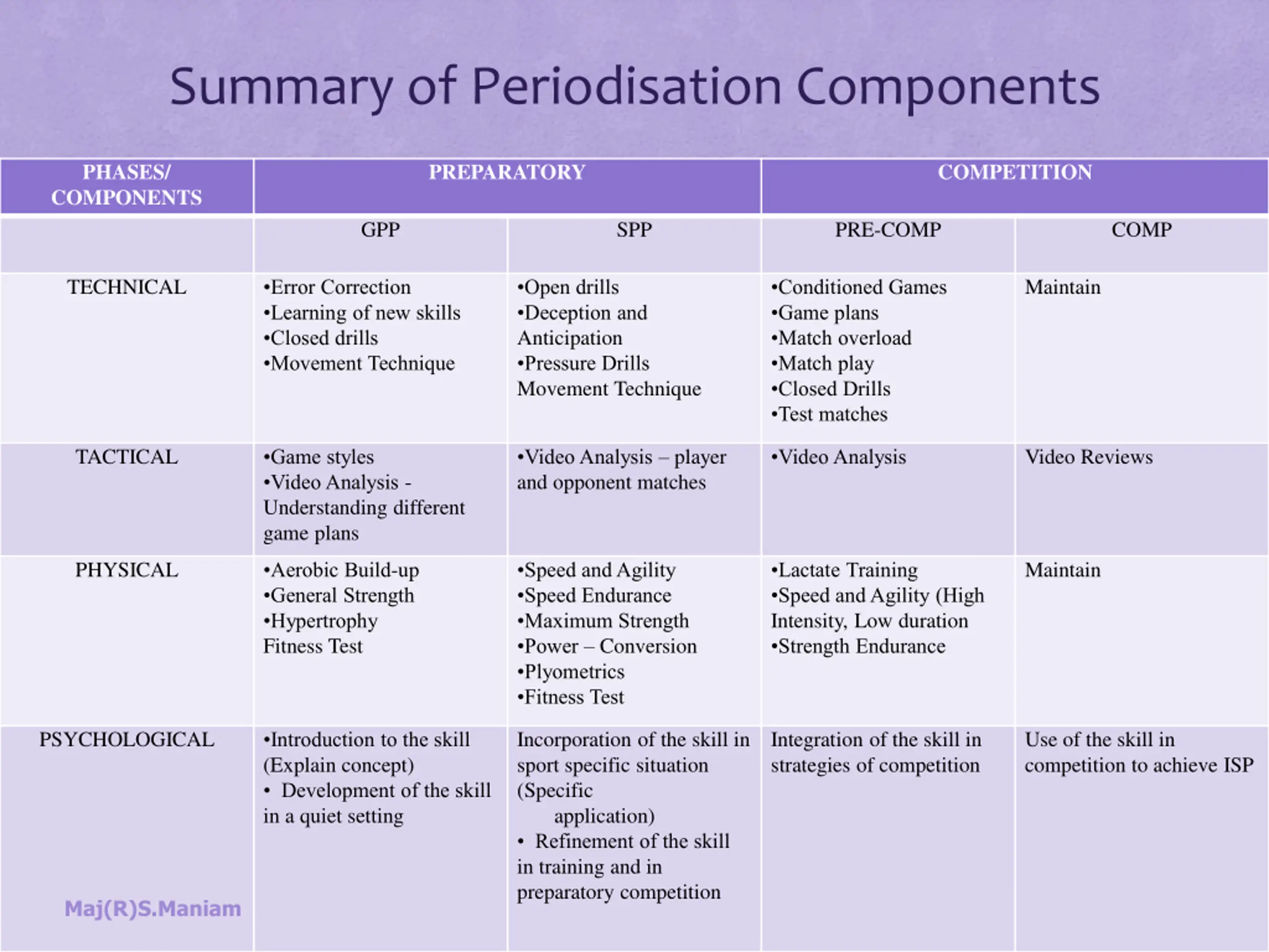 Summary of Periodisation Components PHASES/ COMPONENTS PREPARATORY COMPETITION GPP SPP PRE-COMP COMP TECHNICAL Maintain Error Correction Learning of new skills Closed drills Movement Technique Open drills Deception and Anticipation Pressure Drills Movement Technique Conditioned Games Game plans Match overload Match play Closed Drills Test matches TACTICAL Video Analysis player and opponent matches Video Reviews Game styles Video Analysis - Understanding different game plans Video Analysis PHYSICAL Aerobic Build-up General Strength Hypertrophy Fitness Test Maintain Speed and Agility Speed Endurance Maximum Strength Power Conversion Plyometrics Fitness Test Lactate Training Speed and Agility (High Intensity, Low duration Strength Endurance PSYCHOLOGICAL Incorporation of the skill in sport specific situation (Specific application) Refinement of the skill in training and in preparatory competition Integration of the skill in strategies of competition Use of the skill in competition to achieve ISP Introduction to the skill (Explain concept) Development of the skill in a quiet setting Maj(R)S.Maniam