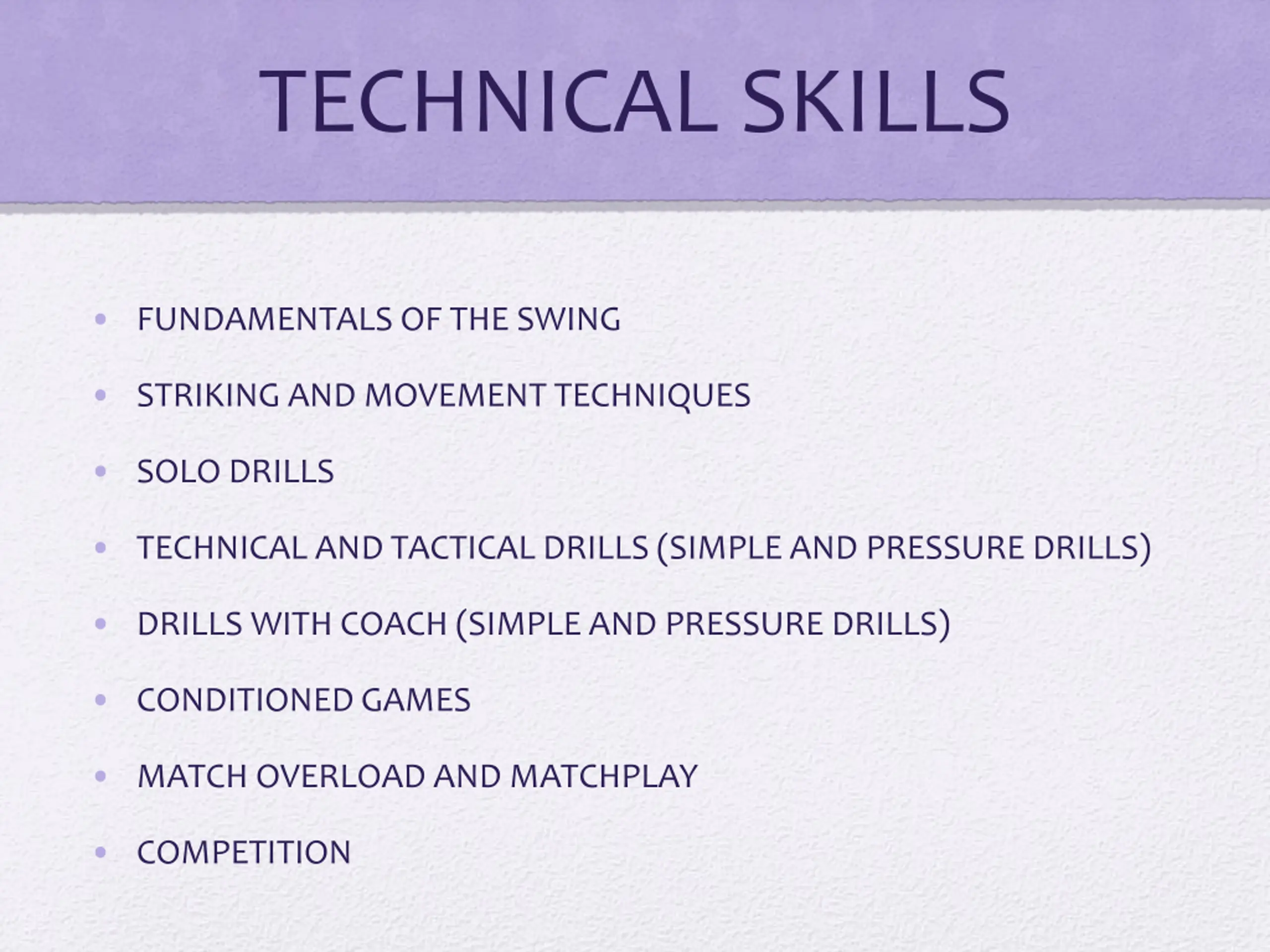 TECHNICAL SKILLS FUNDAMENTALS OF THE SWING STRIKING AND MOVEMENT TECHNIQUES SOLO DRILLS TECHNICAL AND TACTICAL DRILLS (SIMPLE AND PRESSURE DRILLS) DRILLS WITH COACH (SIMPLE AND PRESSURE DRILLS) CONDITIONED GAMES MATCH OVERLOAD AND MATCHPLAY COMPETITION