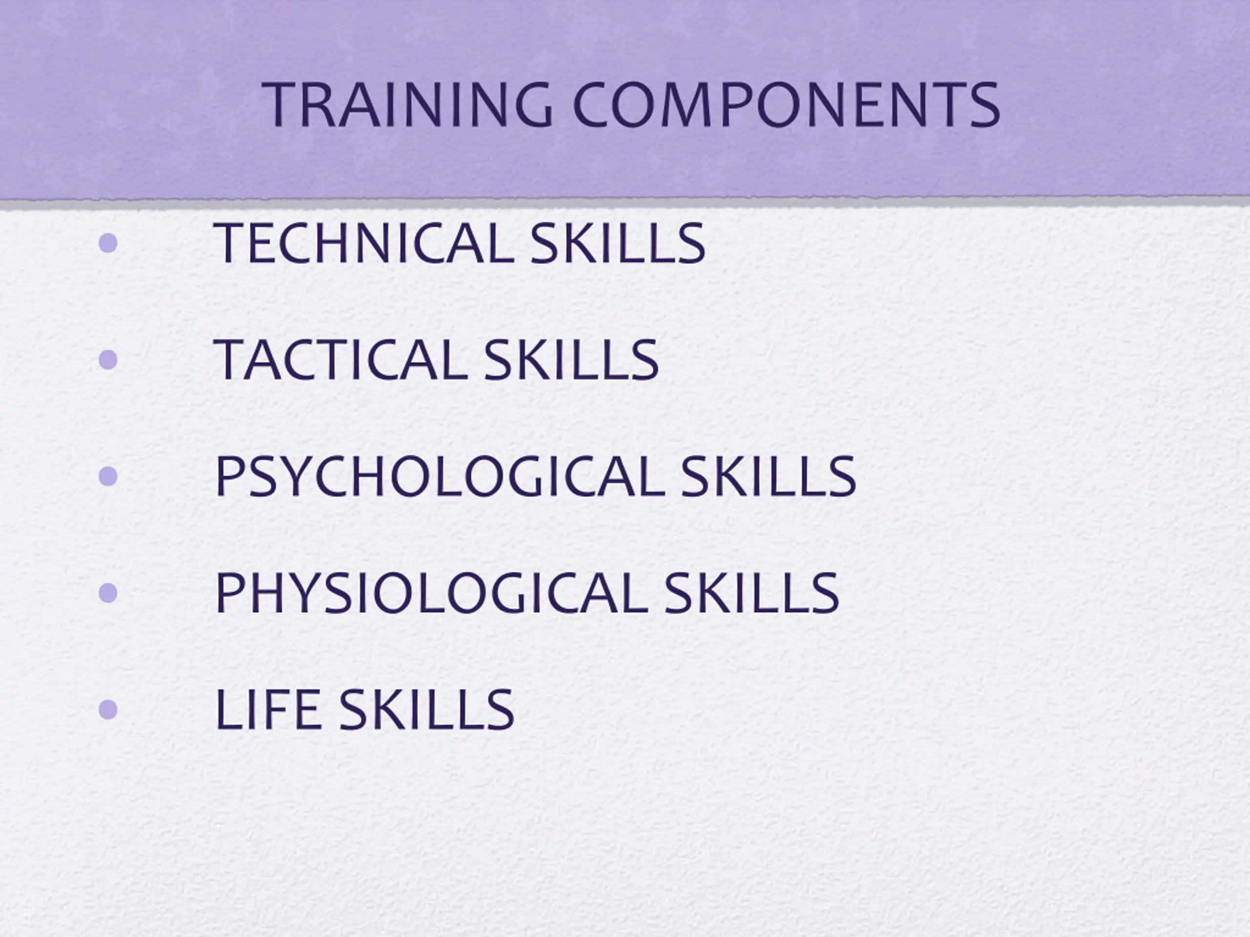 TRAINING COMPONENTS TECHNICAL SKILLS TACTICAL SKILLS PSYCHOLOGICAL SKILLS PHYSIOLOGICAL SKILLS LIFE SKILLS