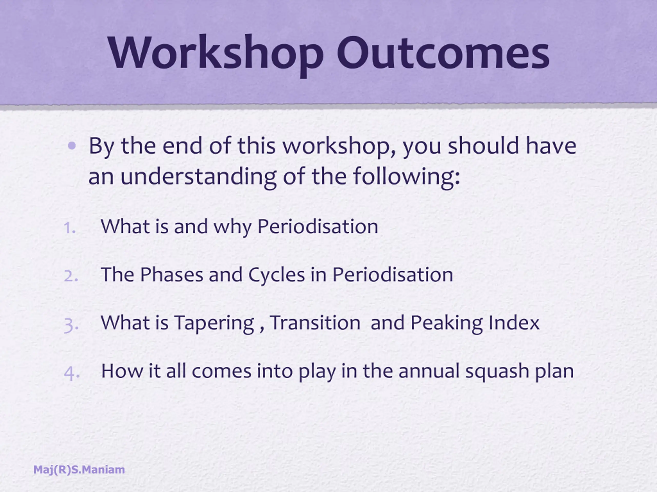Workshop Outcomes By the end of this workshop, you should have an understanding of the following: 1. What is and why Periodisation 2. The Phases and Cycles in Periodisation 3. What is Tapering , Transition and Peaking Index 4. How it all comes into play in the annual squash plan Maj(R)S.Maniam