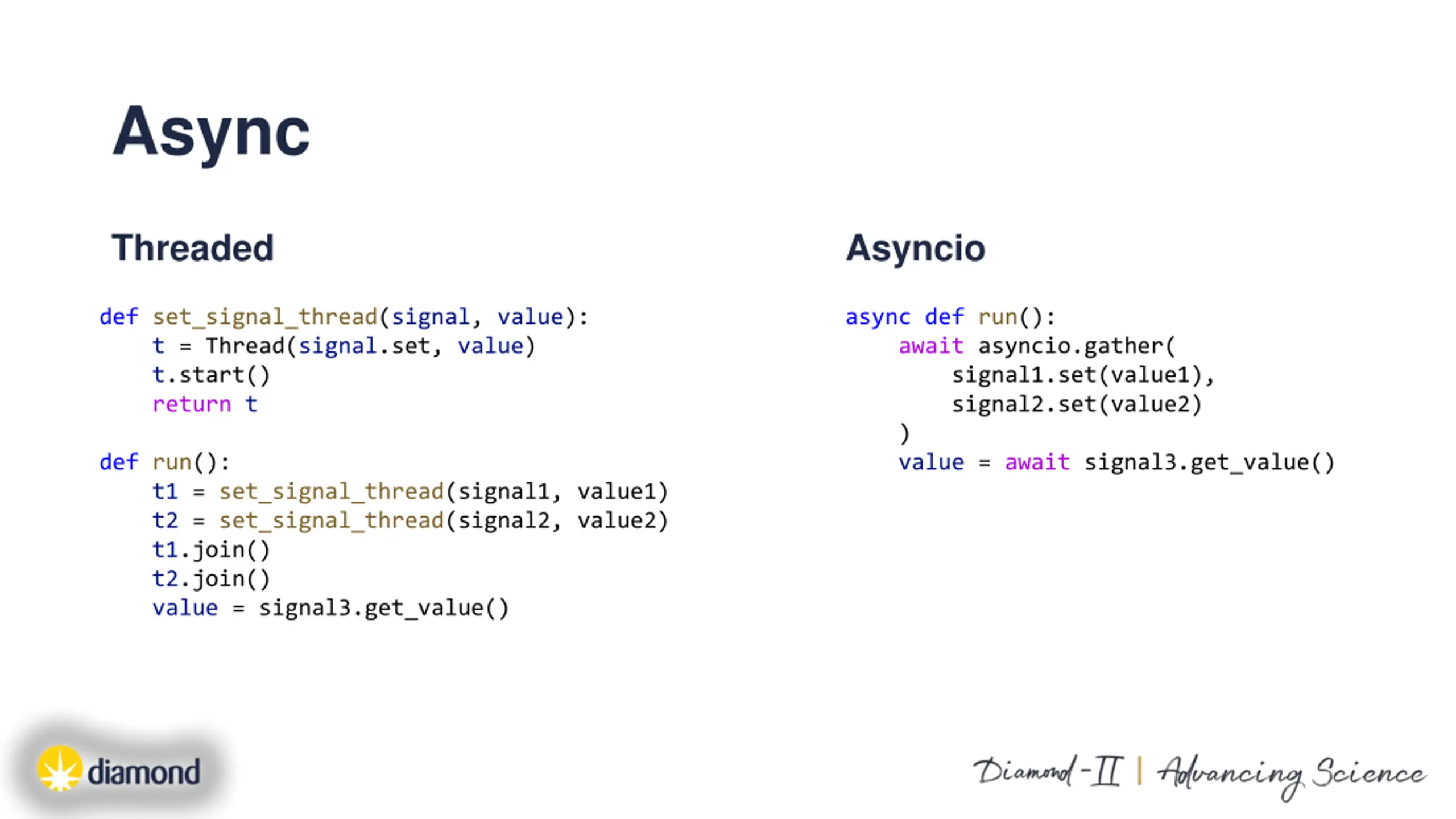 Async Threaded Asyncio def set_signal_thread(signal, value): t = Thread(signal.set, value) t.start() return t async def run(): await asyncio.gather( signal1.set(value1), signal2.set(value2) ) value = await signal3.get_value() def run(): t1 = set_signal_thread(signal1, value1) t2 = set_signal_thread(signal2, value2) t1.join() t2.join() value = signal3.get_value()