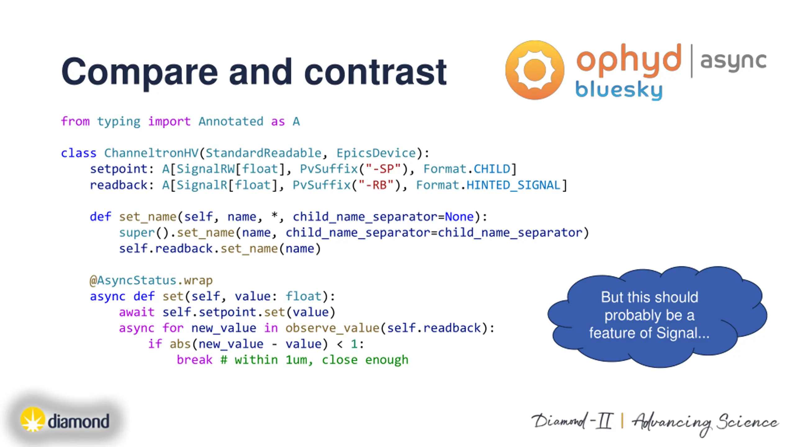 Compare and contrast from typing import Annotated as A class ChanneltronHV(StandardReadable, EpicsDevice): setpoint: A[SignalRW[float], PvSuffix("-SP"), Format.CHILD] readback: A[SignalR[float], PvSuffix("-RB"), Format.HINTED_SIGNAL] def set_name(self, name, *, child_name_separator=None): super().set_name(name, child_name_separator=child_name_separator) self.readback.set_name(name) @AsyncStatus.wrap async def set(self, value: float): await self.setpoint.set(value) async for new_value in observe_value(self.readback): if abs(new_value - value) < 1: break # within 1um, close enough But this should probably be a feature of Signal...