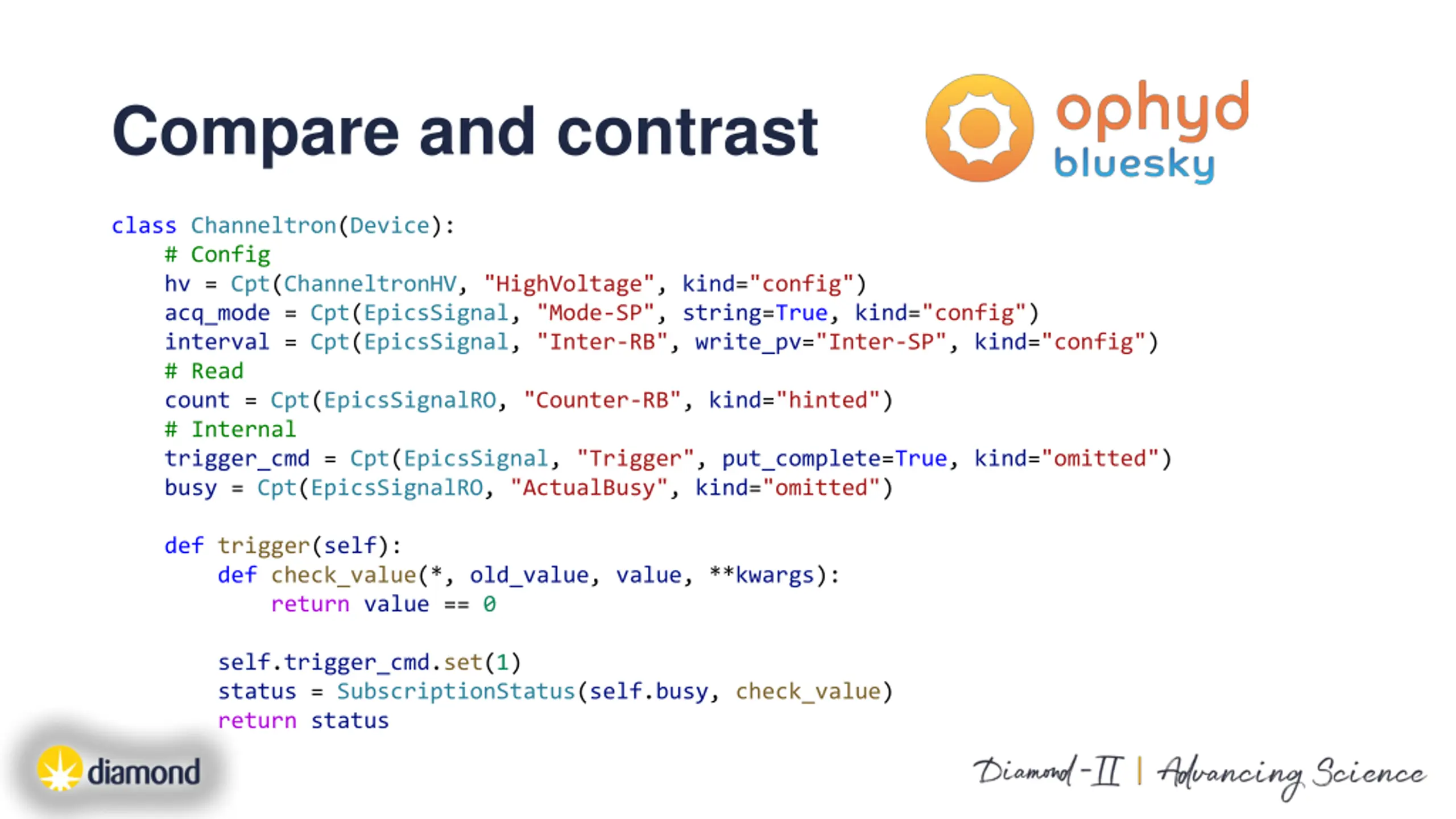 Compare and contrast class Channeltron(Device): # Config hv = Cpt(ChanneltronHV, "HighVoltage", kind="config") acq_mode = Cpt(EpicsSignal, "Mode-SP", string=True, kind="config") interval = Cpt(EpicsSignal, "Inter-RB", write_pv="Inter-SP", kind="config") # Read count = Cpt(EpicsSignalRO, "Counter-RB", kind="hinted") # Internal trigger_cmd = Cpt(EpicsSignal, "Trigger", put_complete=True, kind="omitted") busy = Cpt(EpicsSignalRO, "ActualBusy", kind="omitted") def trigger(self): def check_value(*, old_value, value, **kwargs): return value == 0 self.trigger_cmd.set(1) status = SubscriptionStatus(self.busy, check_value) return status
