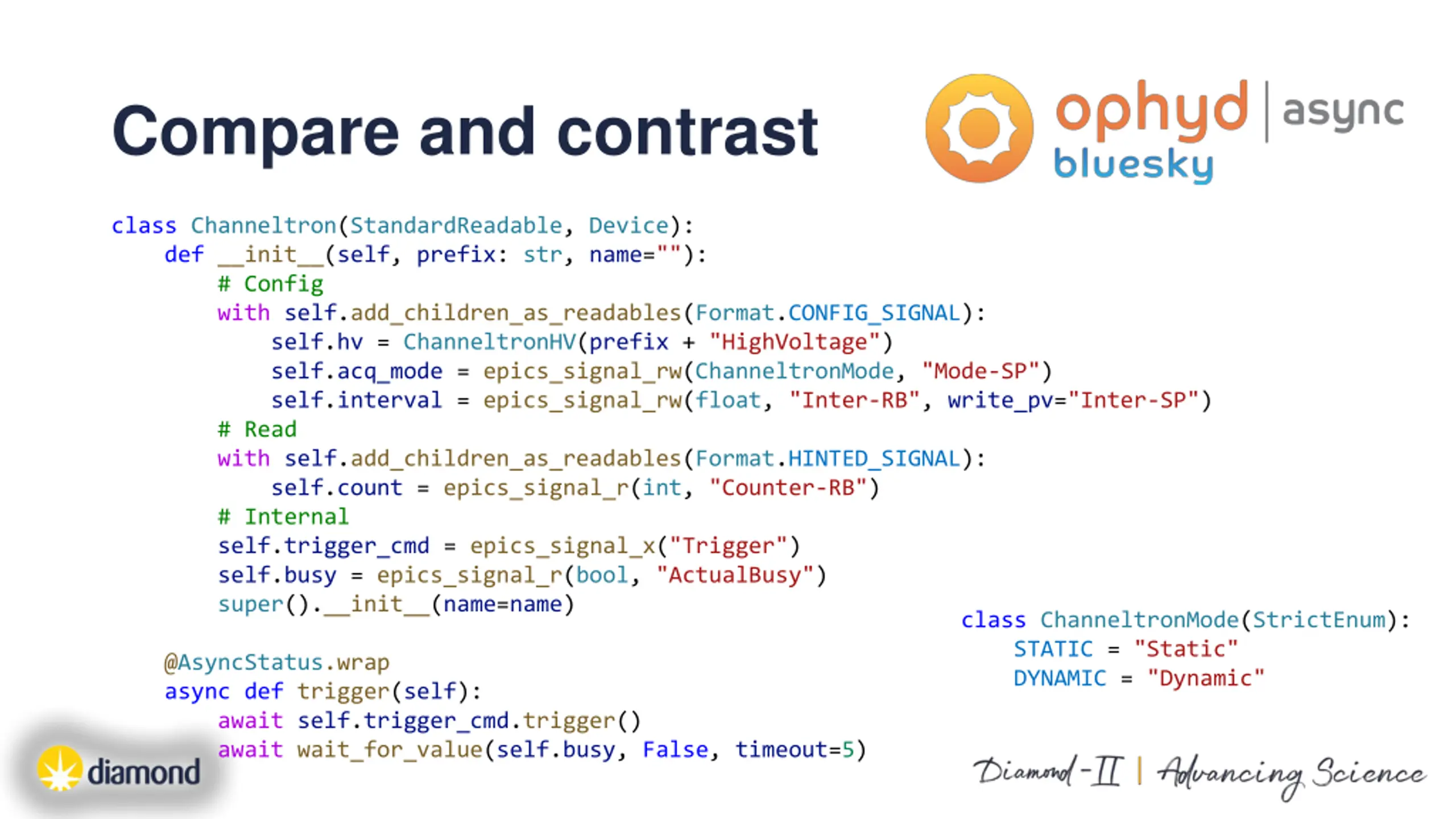 Compare and contrast class Channeltron(StandardReadable, Device): def __init__(self, prefix: str, name=""): # Config with self.add_children_as_readables(Format.CONFIG_SIGNAL): self.hv = ChanneltronHV(prefix + "HighVoltage") self.acq_mode = epics_signal_rw(ChanneltronMode, "Mode-SP") self.interval = epics_signal_rw(float, "Inter-RB", write_pv="Inter-SP") # Read with self.add_children_as_readables(Format.HINTED_SIGNAL): self.count = epics_signal_r(int, "Counter-RB") # Internal self.trigger_cmd = epics_signal_x("Trigger") self.busy = epics_signal_r(bool, "ActualBusy") super().__init__(name=name) class ChanneltronMode(StrictEnum): STATIC = "Static" DYNAMIC = "Dynamic" @AsyncStatus.wrap async def trigger(self): await self.trigger_cmd.trigger() await wait_for_value(self.busy, False, timeout=5)