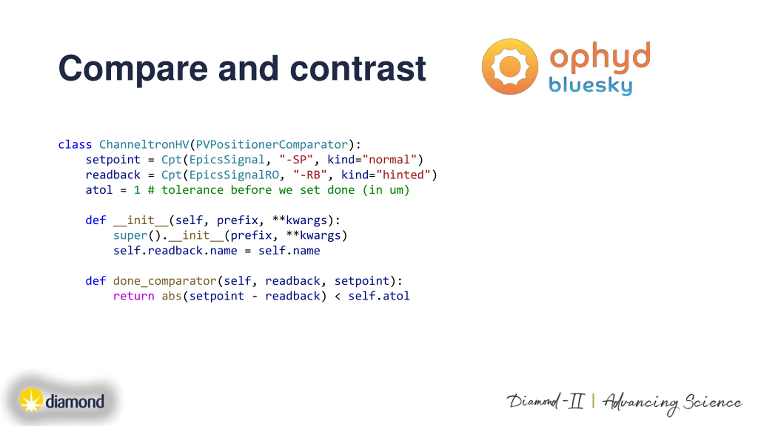 Compare and contrast class ChanneltronHV(PVPositionerComparator): setpoint = Cpt(EpicsSignal, "-SP", kind="normal") readback = Cpt(EpicsSignalRO, "-RB", kind="hinted") atol = 1 # tolerance before we set done (in um) def __init__(self, prefix, **kwargs): super().__init__(prefix, **kwargs) self.readback.name = self.name def done_comparator(self, readback, setpoint): return abs(setpoint - readback) < self.atol