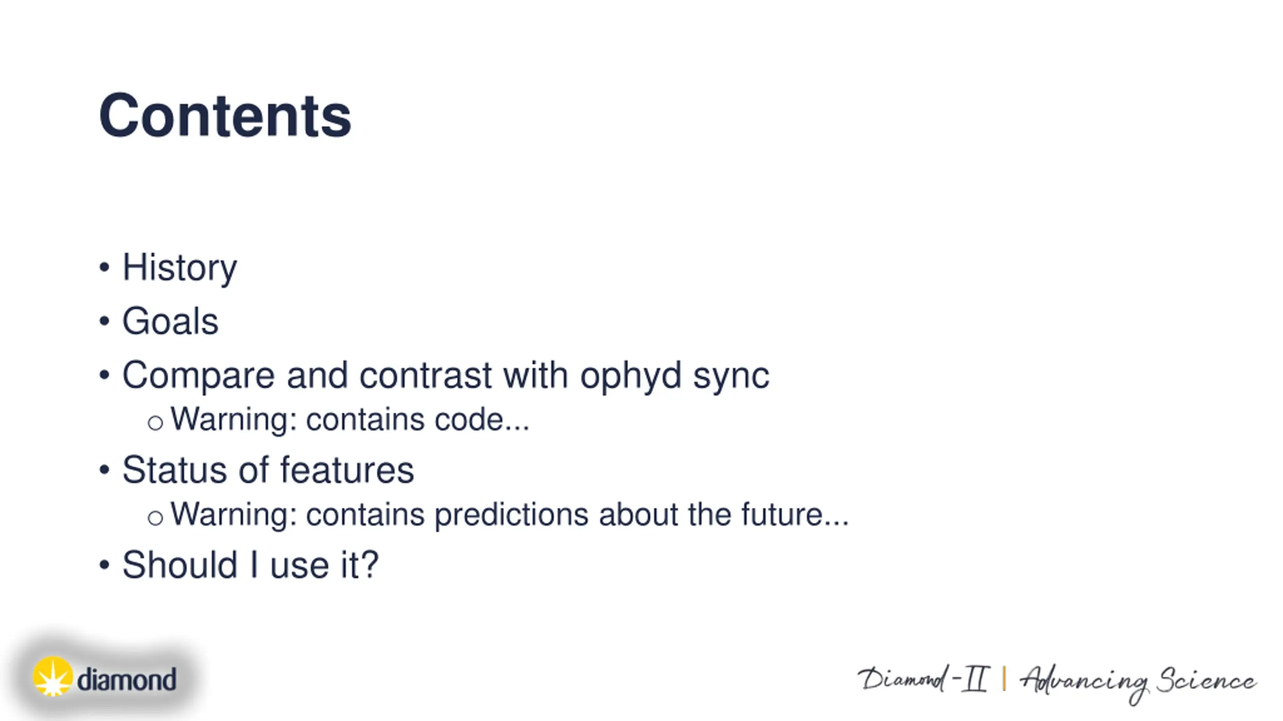 Contents History Goals Compare and contrast with ophyd sync oWarning: contains code... Status of features oWarning: contains predictions about the future... Should I use it?