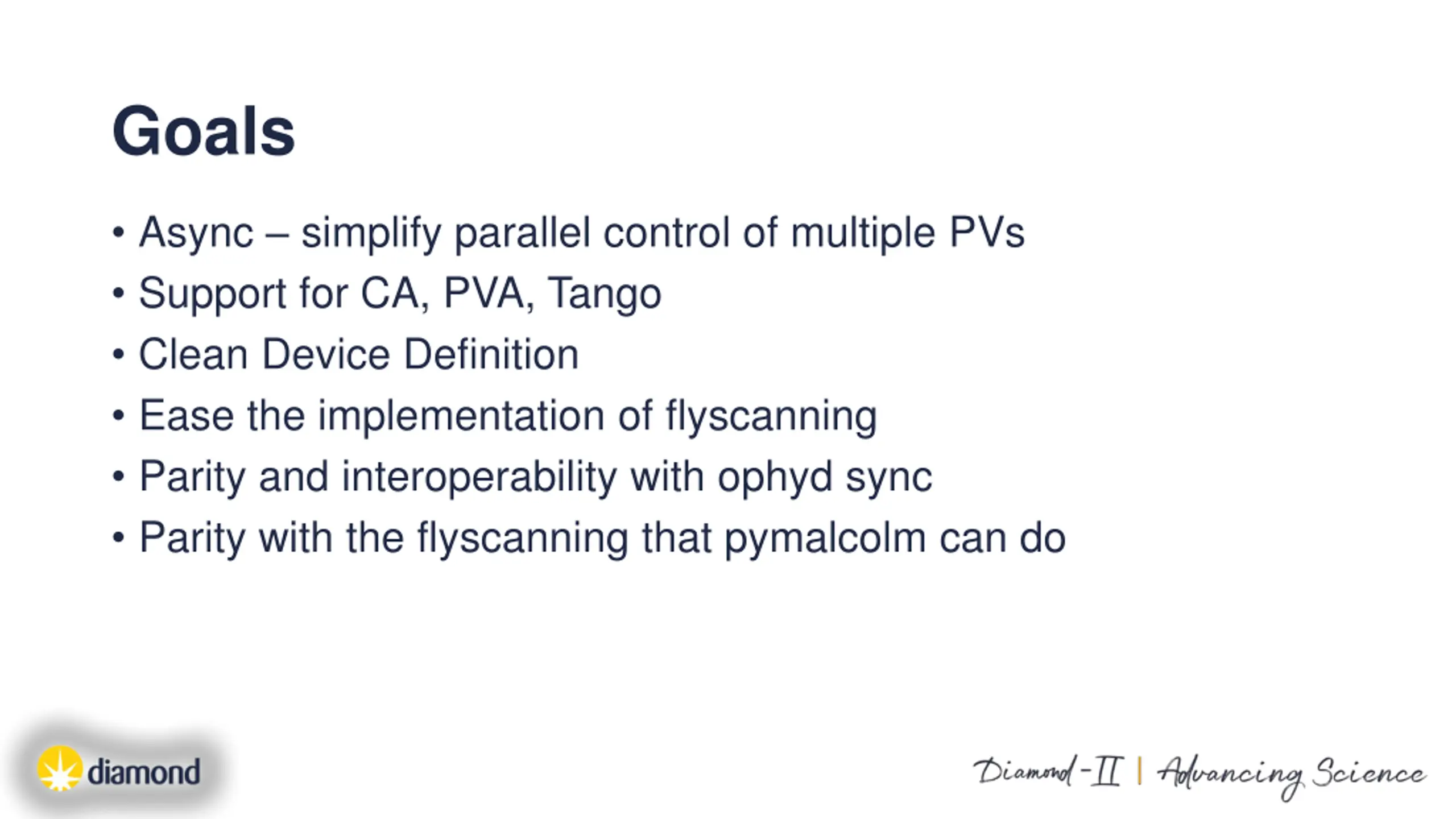 Goals Async simplify parallel control of multiple PVs Support for CA, PVA, Tango Clean Device Definition Ease the implementation of flyscanning Parity and interoperability with ophyd sync Parity with the flyscanning that pymalcolm can do