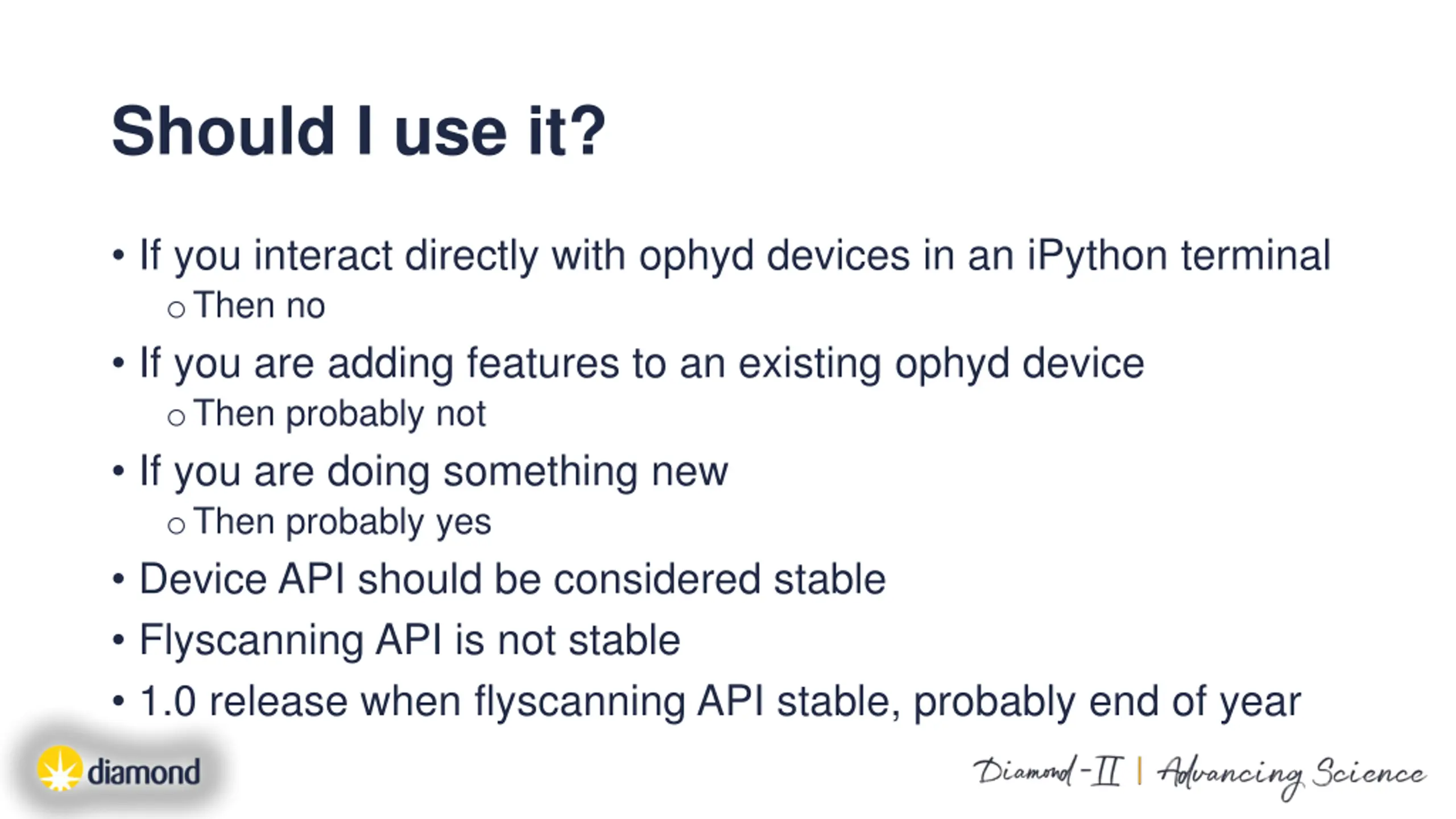 Should I use it? If you interact directly with ophyd devices in an iPython terminal oThen no If you are adding features to an existing ophyd device oThen probably not If you are doing something new oThen probably yes Device API should be considered stable Flyscanning API is not stable 1.0 release when flyscanning API stable, probably end of year