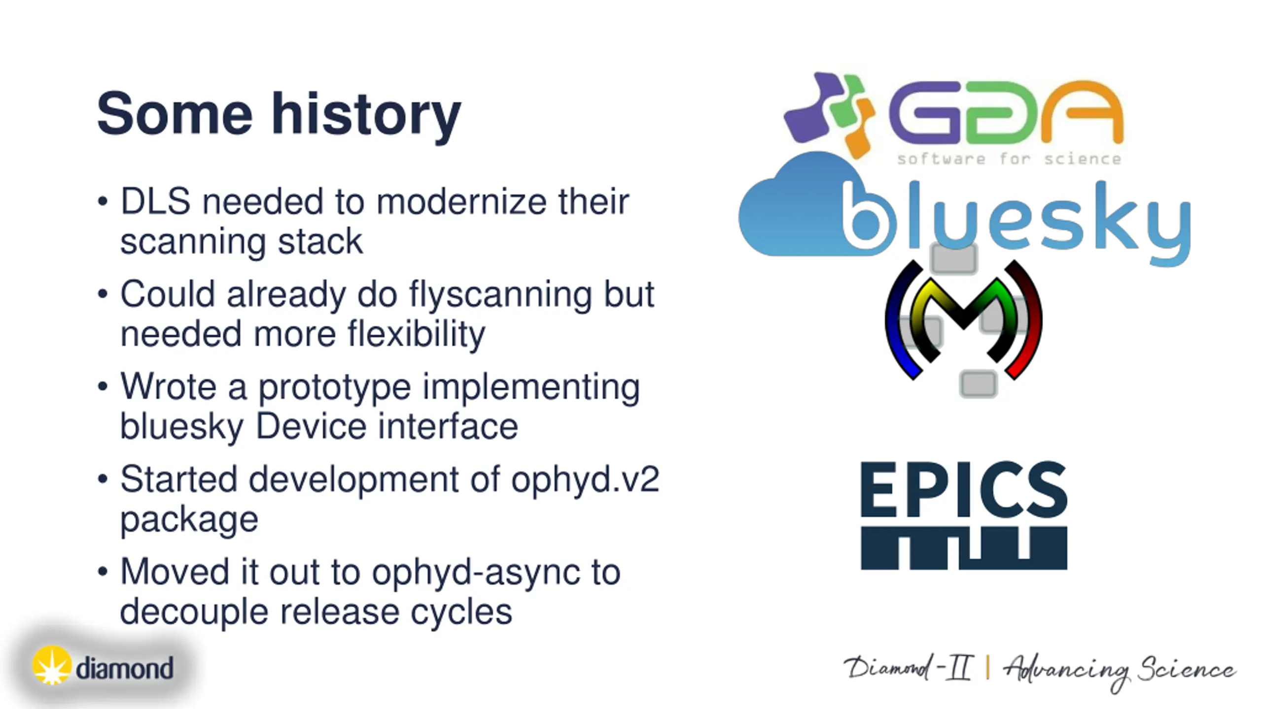 Some history DLS needed to modernize their scanning stack Could already do flyscanning but needed more flexibility Wrote a prototype implementing bluesky Device interface Started development of ophyd.v2 package Moved it out to ophyd-async to decouple release cycles
