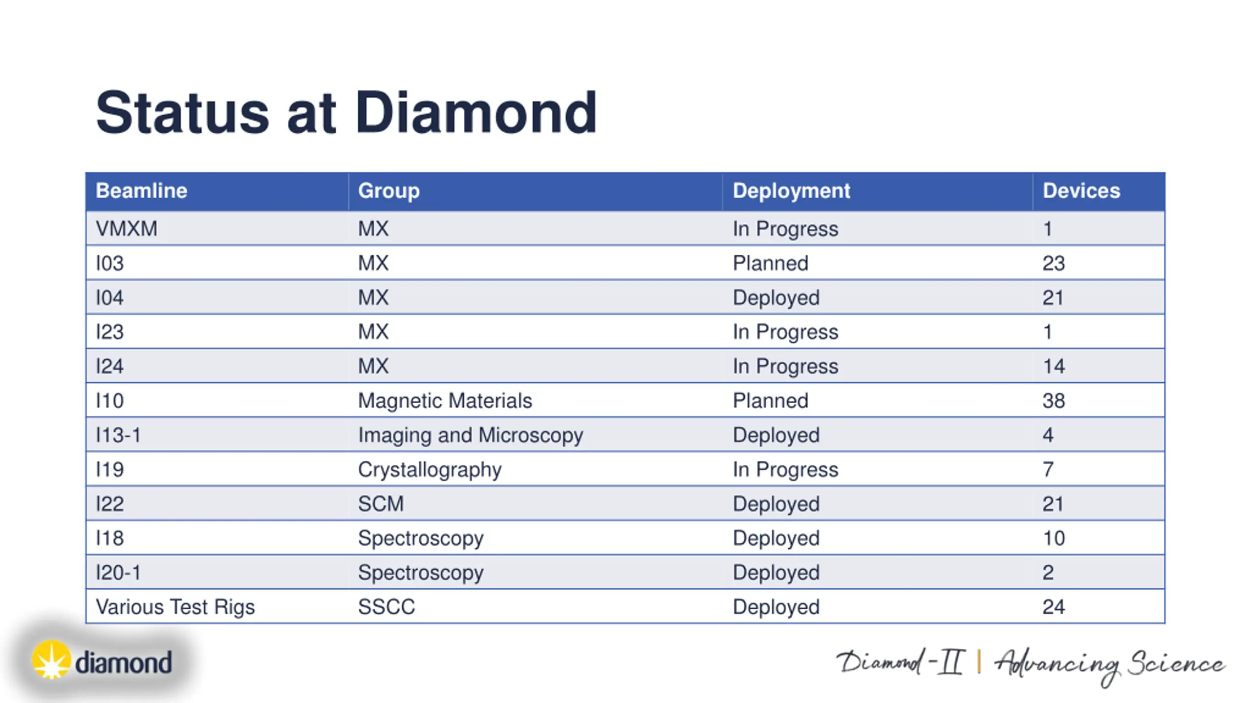 Status at Diamond Beamline Group Deployment Devices VMXM I03 I04 I23 I24 I10 I13-1 I19 I22 I18 I20-1 Various Test Rigs MX MX MX MX MX Magnetic Materials Imaging and Microscopy Crystallography SCM Spectroscopy Spectroscopy SSCC In Progress Planned Deployed In Progress In Progress Planned Deployed In Progress Deployed Deployed Deployed Deployed 1 23 21 1 14 38 4 7 21 10 2 24