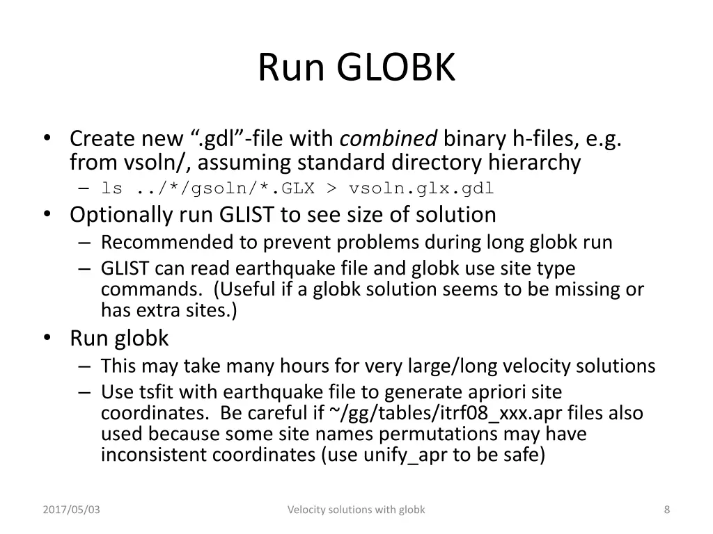 Run GLOBK Create new .gdl -file with combined binary h-files, e.g. from vsoln/, assuming standard directory hierarchy ls ../*/gsoln/*.GLX > vsoln.glx.gdl Optionally run GLIST to see size of solution Recommended to prevent problems during long globk run GLIST can read earthquake file and globk use site type commands. (Useful if a globk solution seems to be missing or has extra sites.) Run globk This may take many hours for very large/long velocity solutions Use tsfit with earthquake file to generate apriori site coordinates. Be careful if ~/gg/tables/itrf08_xxx.apr files also used because some site names permutations may have inconsistent coordinates (use unify_apr to be safe) 2017/05/03 Velocity solutions with globk 8