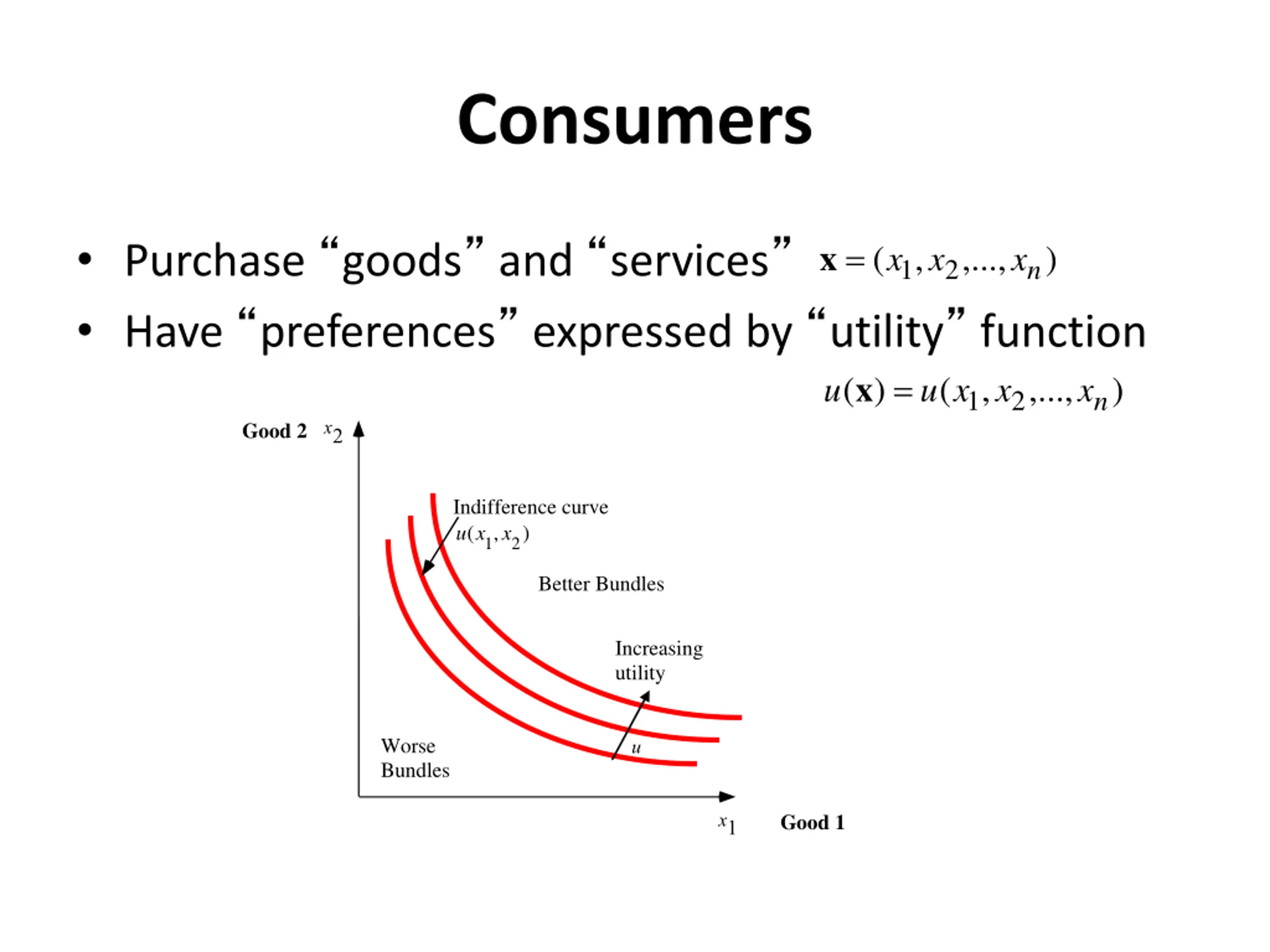 Consumers Purchase goods and services Have preferences expressed by utility function = x ( , ,..., ) x x n x 1 2 = x ( ) ( , ,..., ) u u x x n x 1 2 x2 Good 2 Indifference curve ) , ( 2 u x 1x Better Bundles Increasing utility Worse Bundles u x1 Good 1