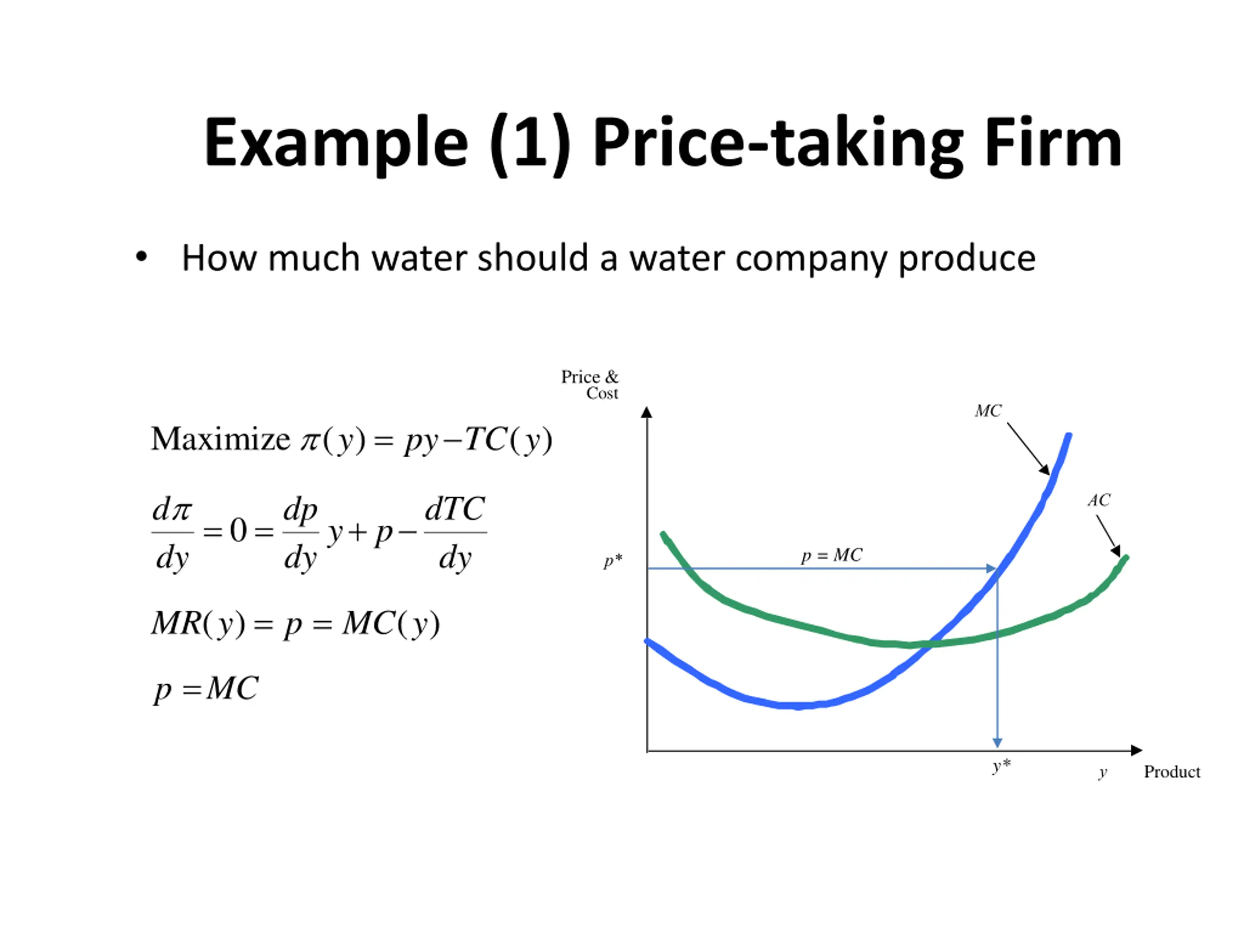 Example (1) Price-taking Firm How much water should a water company produce Cost Price & MC = Maximize ( ) ( ) y py TC y d dp dTC AC = 0 = + y p dy dy dy p = MC p* = = ( ) ( ) MR y p MC y p = MC y* Product y