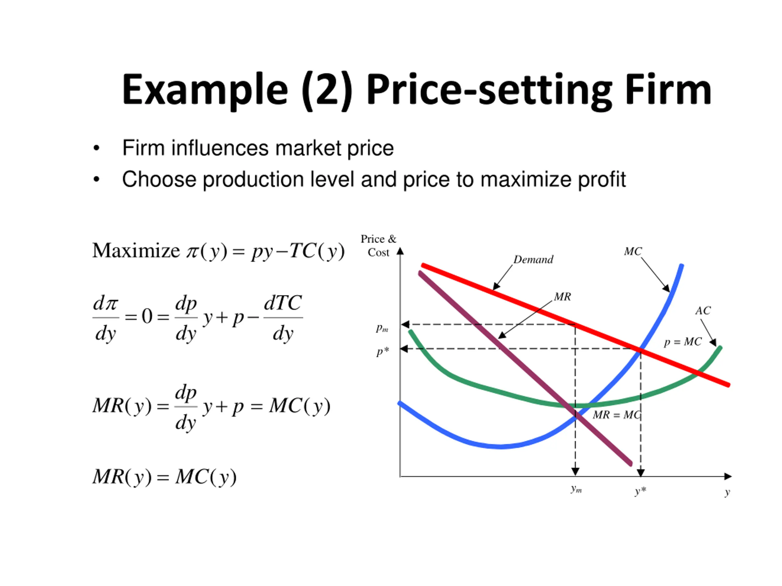 Example (2) Price-setting Firm Firm influences market price Choose production level and price to maximize profit Price & Cost = Maximize ( ) ( ) y py TC y MC Demand MR d dp dTC = 0 = + y p AC pm dy dy dy p = MC p* dp = + = ( ) ( ) MR y y p MC y MR = MC dy = ( ) ( ) MR y MC y ym y* y