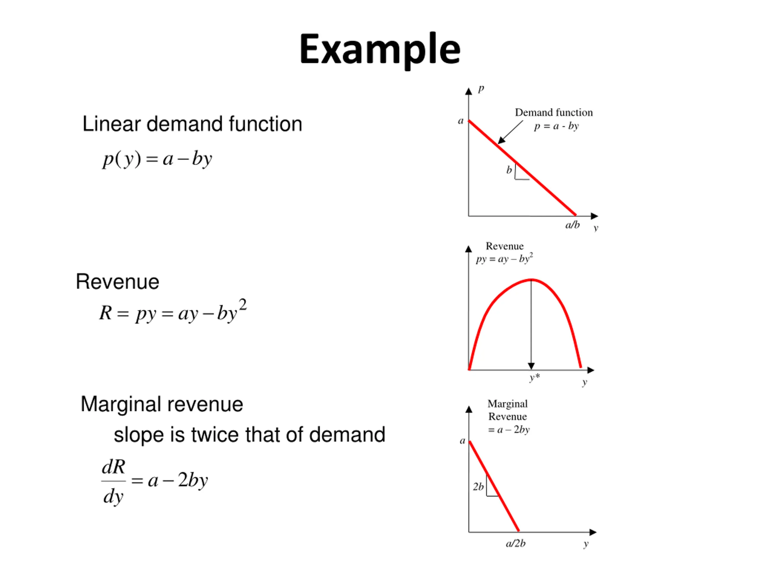 Example p Marginal Revenue = a 2by Revenue py = ay by2 Demand function p = a - by Linear demand function by a y p = ) ( a a b 2b y* a/b y y a/2b y p Marginal Revenue = a 2by Revenue py = ay by2 Demand function p = a - by Revenue R = a a 2 = py ay by b 2b y* a/b y y a/2b y Marginal revenue slope is twice that of demand dR 2 = b p Marginal Revenue = a 2by Revenue py = ay by2 Demand function p = a - by a a a by 2b dy y* a/b y y a/2b y