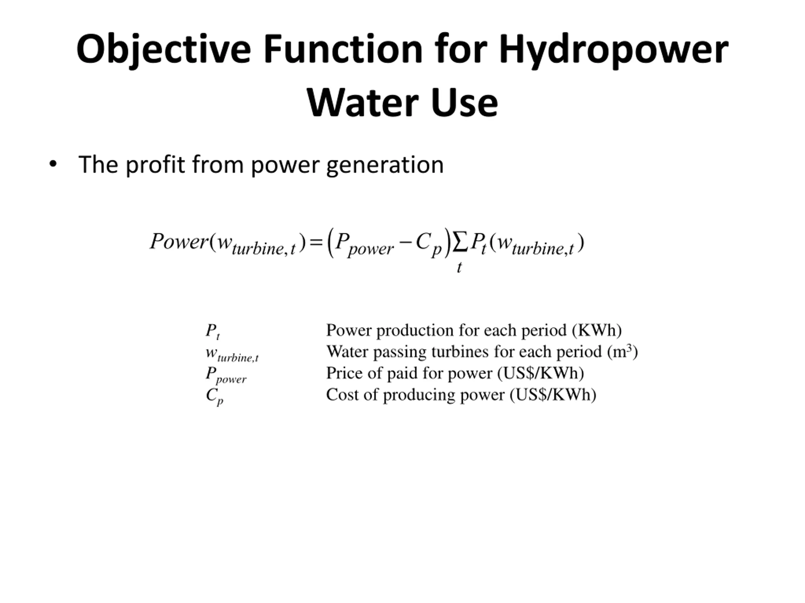 Objective Function for Hydropower Water Use The profit from power generation ( ) Pt(wturbine,t) t Power(wturbine,t)= Ppower-Cp Pt wturbine,t Ppower Cp Power production for each period (KWh) Water passing turbines for each period (m3) Price of paid for power (US$/KWh) Cost of producing power (US$/KWh)