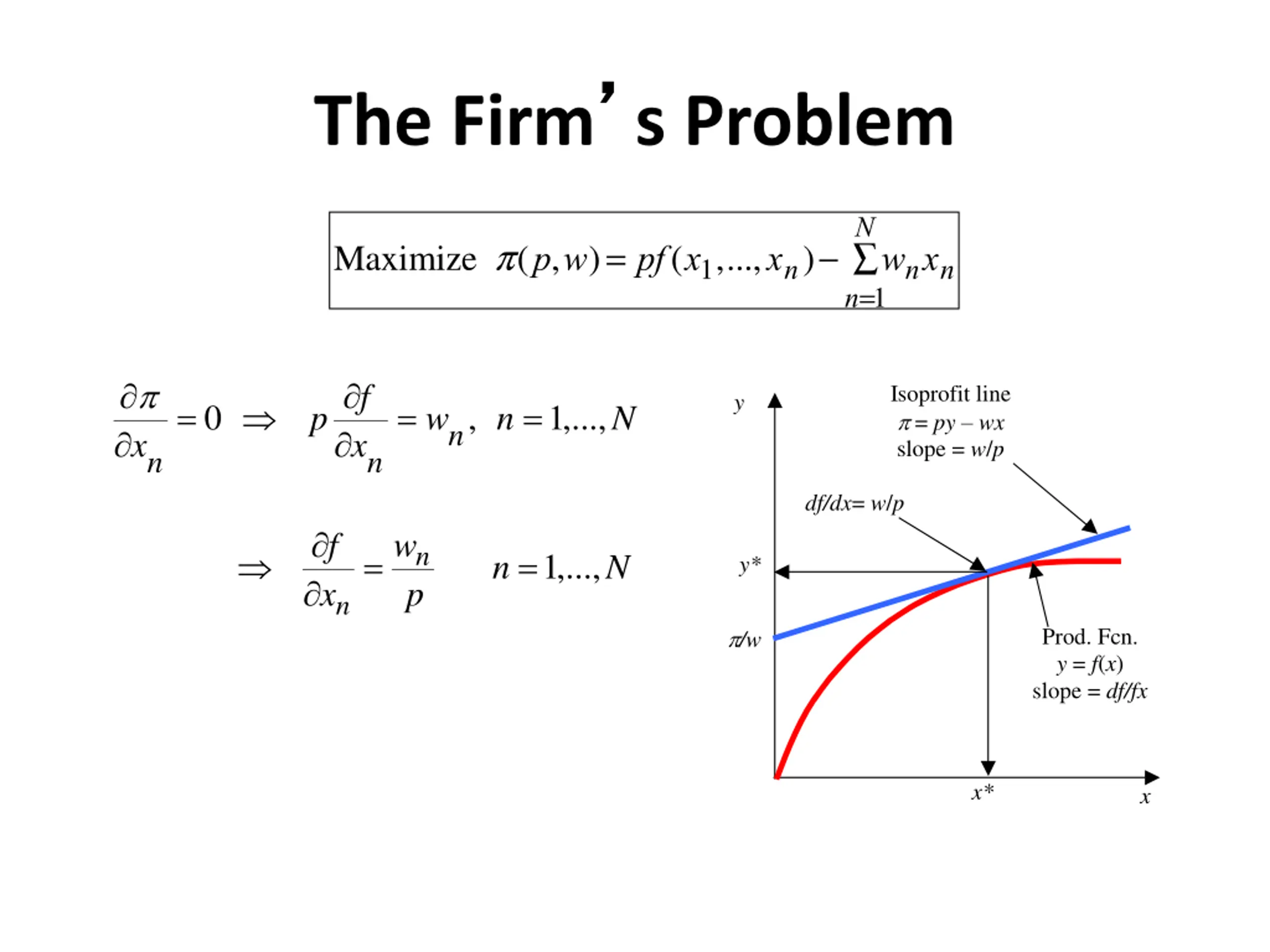 The Firm s Problem N Maximize p(p,w)= pf(x1,...,xn)- wnxn n=1 f Isoprofit line = py wx slope = w/p y = = = 0 , ,..., 1 p w n N n x x n n df/dx= w/p w f n = = ,..., 1 n N y* x p n Prod. Fcn. y = f(x) slope = df/fx /w x* x