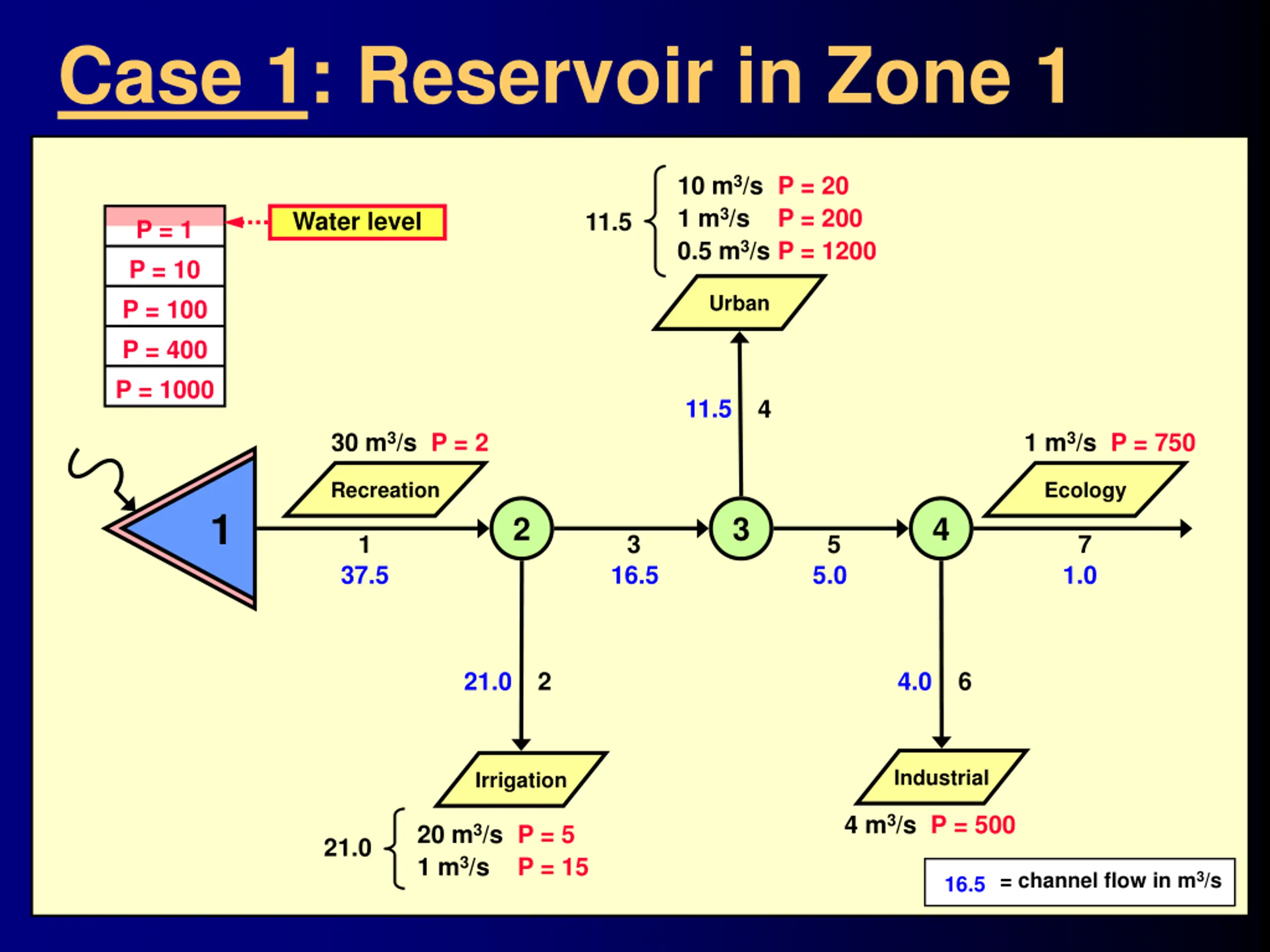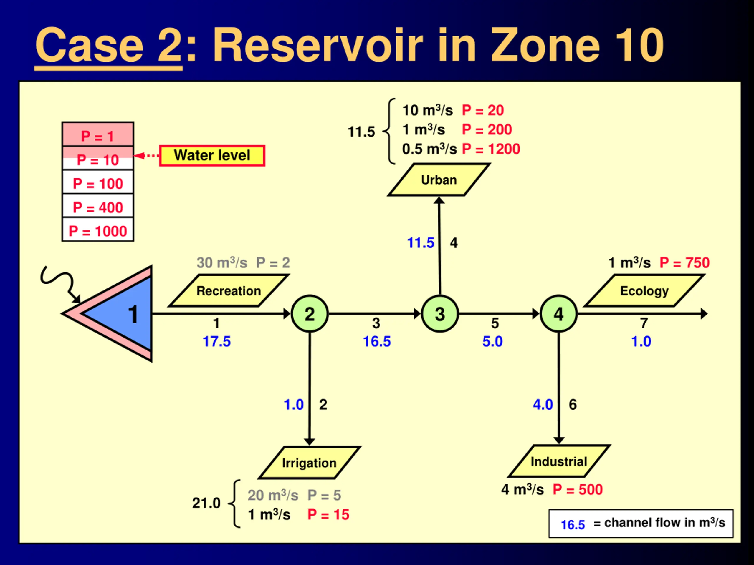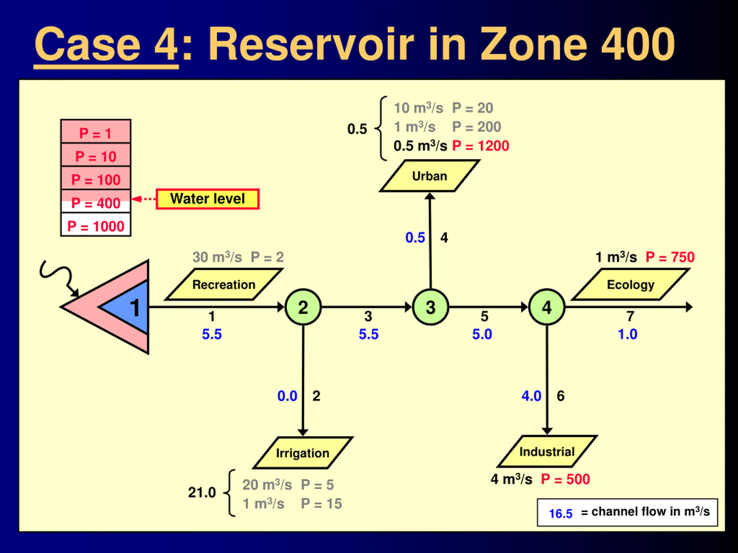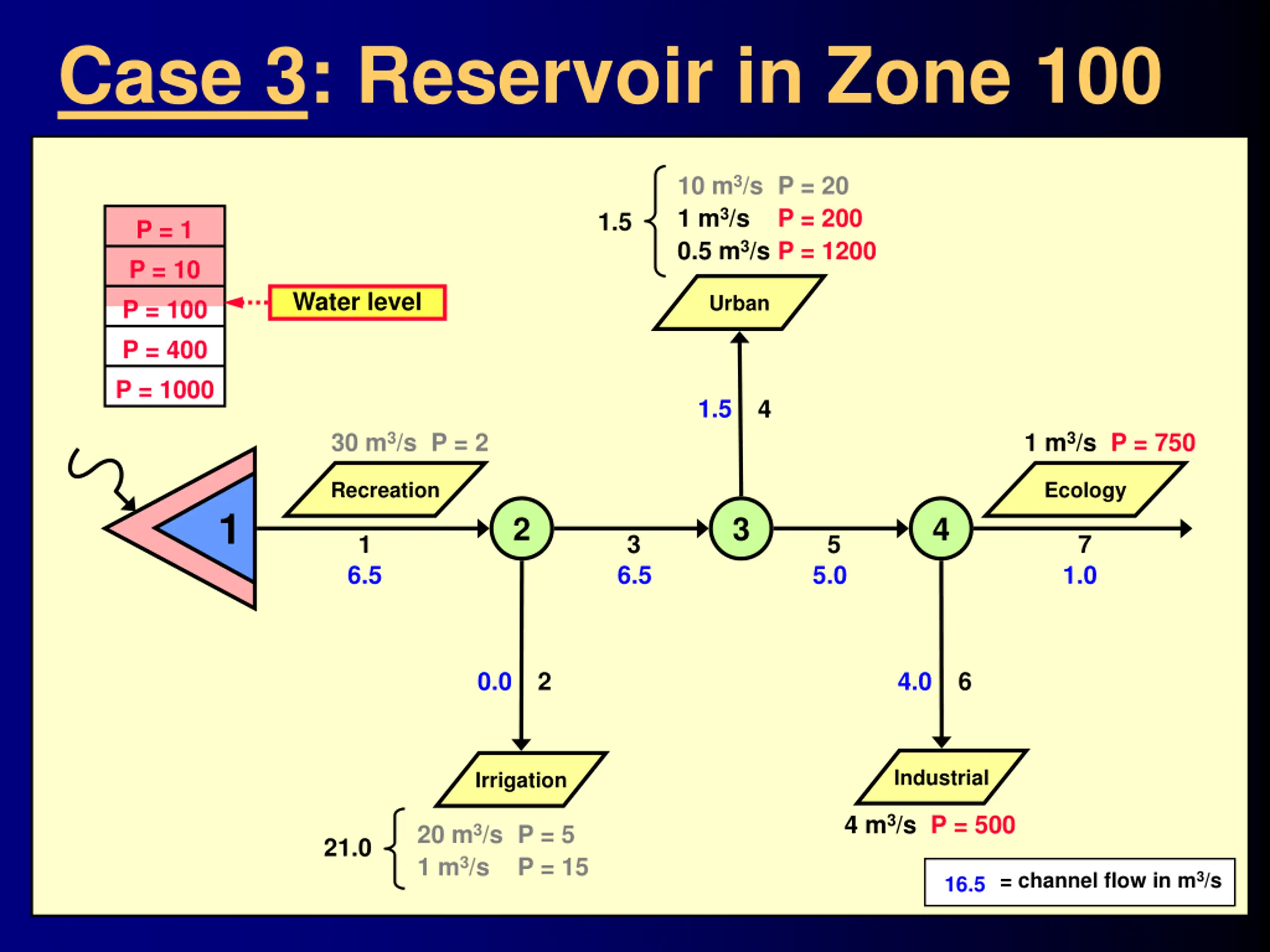 Case 3: Reservoir in Zone 100 10 m3/s 1 m3/s 0.5 m3/s P = 20 P = 200 P = 1200 1.5 P = 1 P = 10 P = 100 P = 400 P = 1000 Water level Urban 1.5 4 30 m3/s P = 2 1 m3/s P = 750 Recreation Ecology 1 2 3 4 1 3 5 7 6.5 6.5 5.0 1.0 0.0 2 4.0 6 Industrial Irrigation 4 m3/s P = 500 20 m3/s 1 m3/s P = 5 P = 15 21.0 = channel flow in m3/s 16.5
