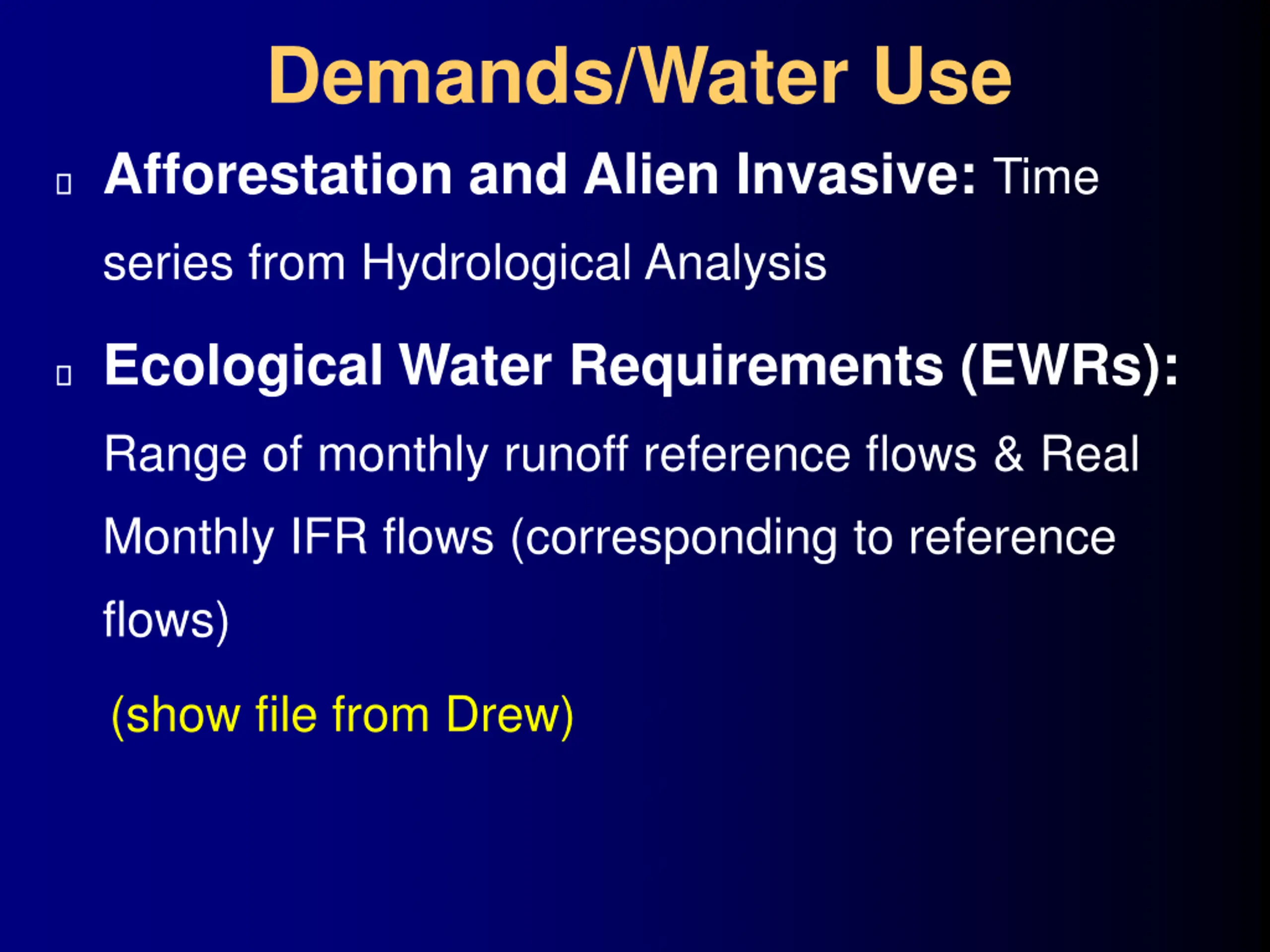 Demands/Water Use Afforestation and Alien Invasive: Time series from Hydrological Analysis EcologicalWater Requirements (EWRs): Range of monthly runoff reference flows & Real Monthly IFR flows (corresponding to reference flows) (show file from Drew)