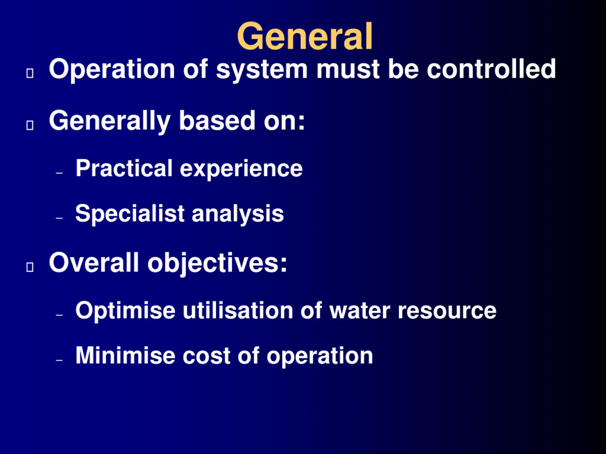 General Operation of system must be controlled Generally based on: Practical experience Specialist analysis Overall objectives: Optimise utilisation of water resource Minimise cost of operation