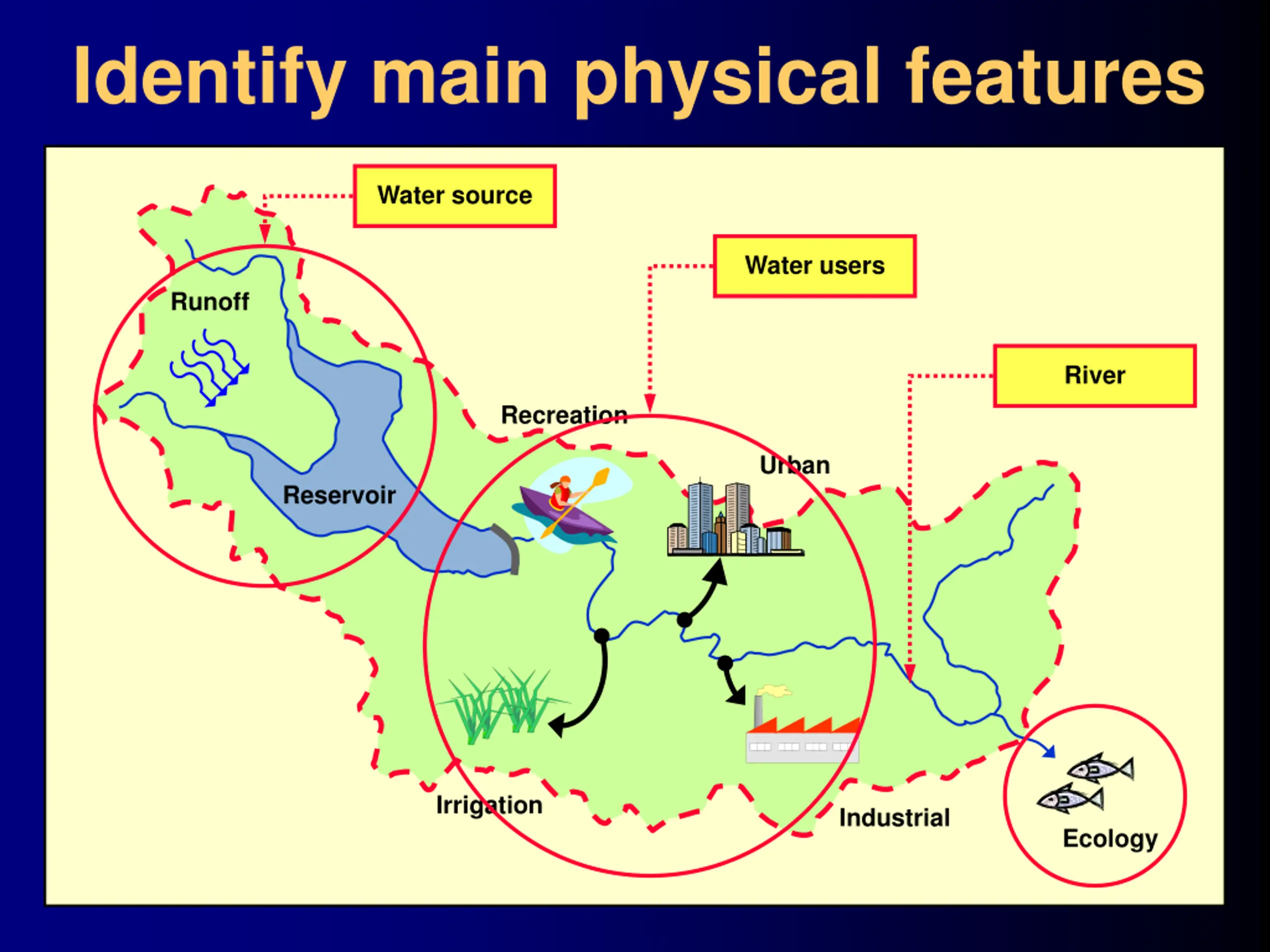 Identify main physical features Water source Water users Runoff River Recreation Urban Reservoir Irrigation Industrial Ecology