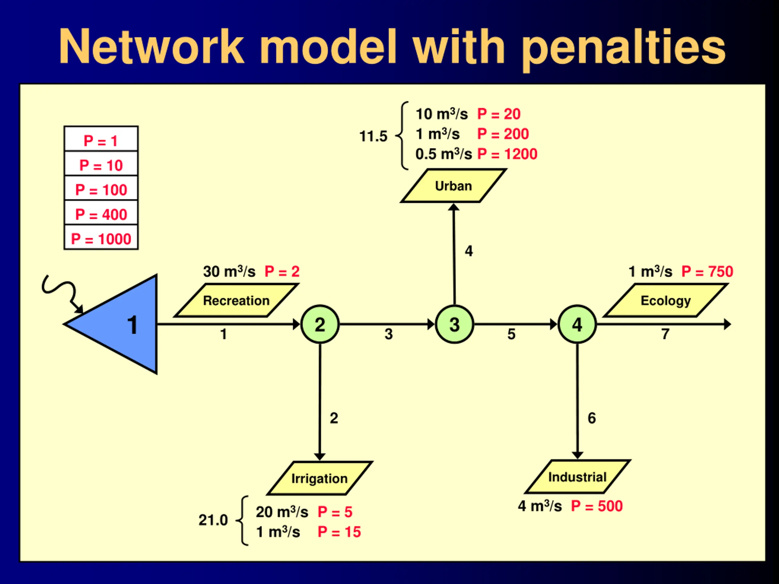 Network model with penalties 10 m3/s 1 m3/s 0.5 m3/s P = 20 P = 200 P = 1200 11.5 P = 1 P = 10 P = 100 P = 400 P = 1000 Urban 4 30 m3/s P = 2 1 m3/s P = 750 Recreation Ecology 1 2 3 4 1 3 5 7 2 6 Industrial Irrigation 4 m3/s P = 500 20 m3/s 1 m3/s P = 5 P = 15 21.0