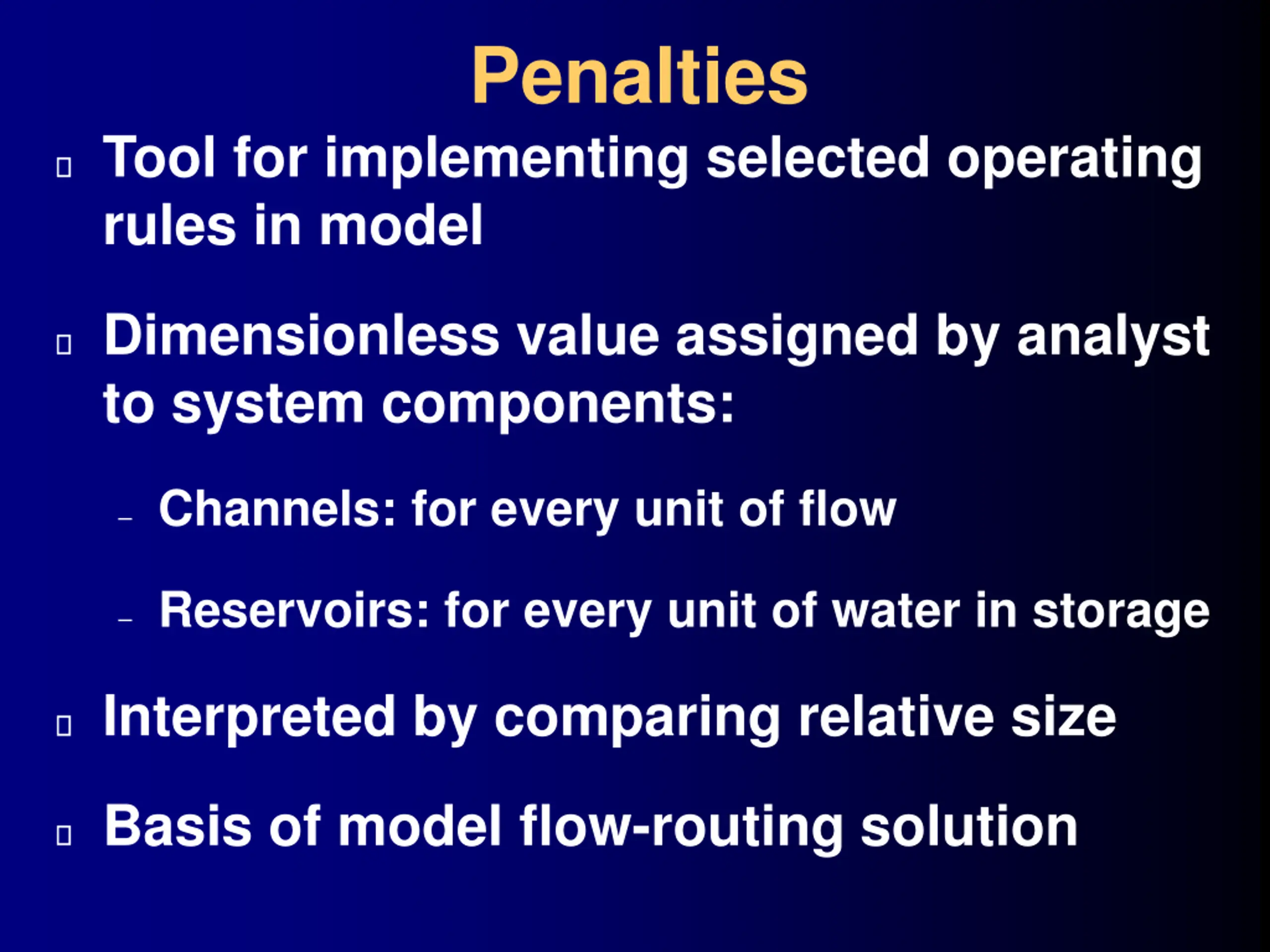 Penalties Tool for implementing selected operating rules in model Dimensionless value assigned by analyst to system components: Channels: for every unit of flow Reservoirs: for every unit of water in storage Interpreted by comparing relative size Basis of model flow-routing solution