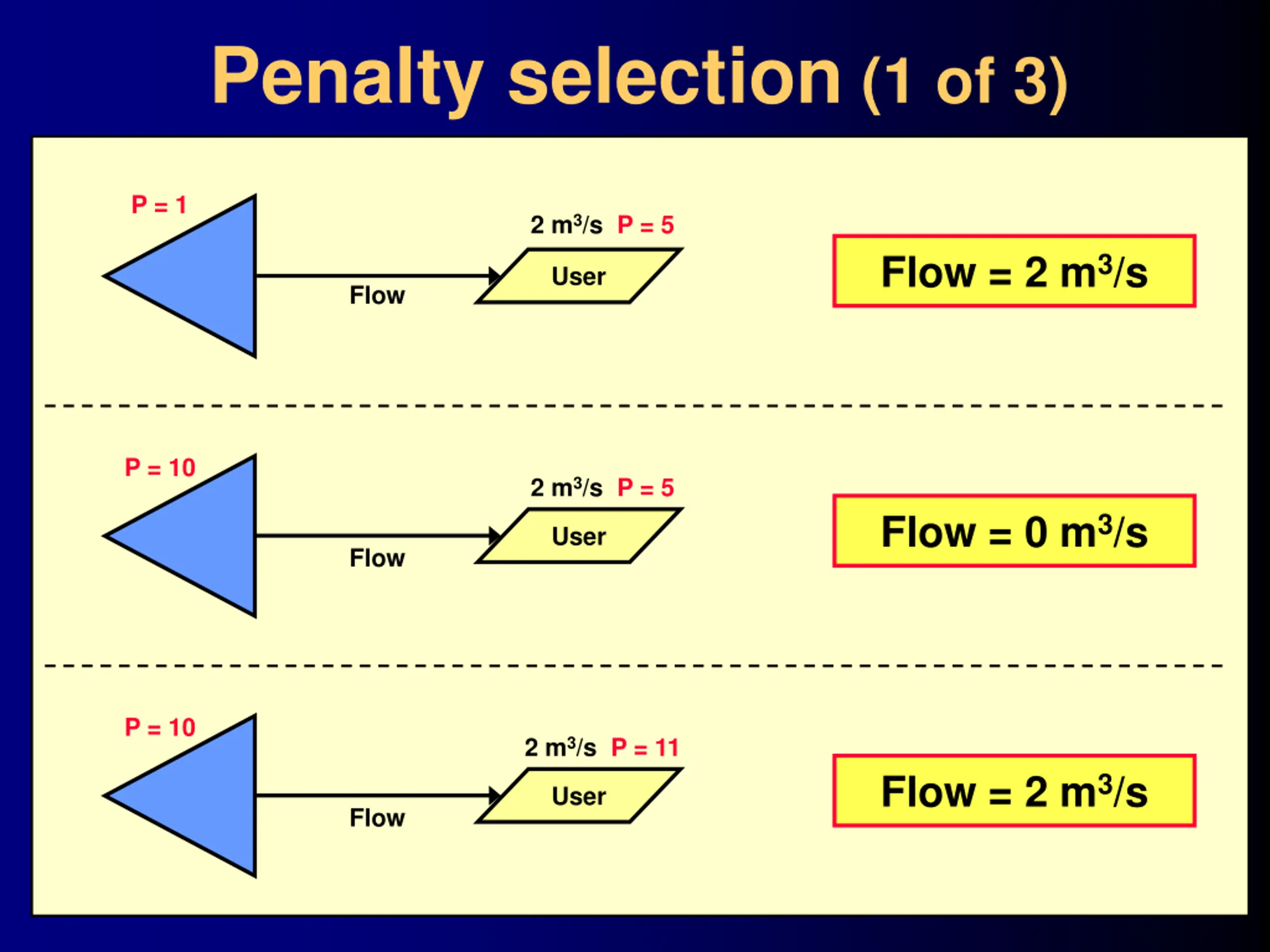 Penalty selection (1 of 3) P = 1 2 m3/s P = 5 Flow = 2 m3/s User Flow P = 10 2 m3/s P = 5 Flow = 0 m3/s User Flow P = 10 2 m3/s P = 11 Flow = 2 m3/s User Flow