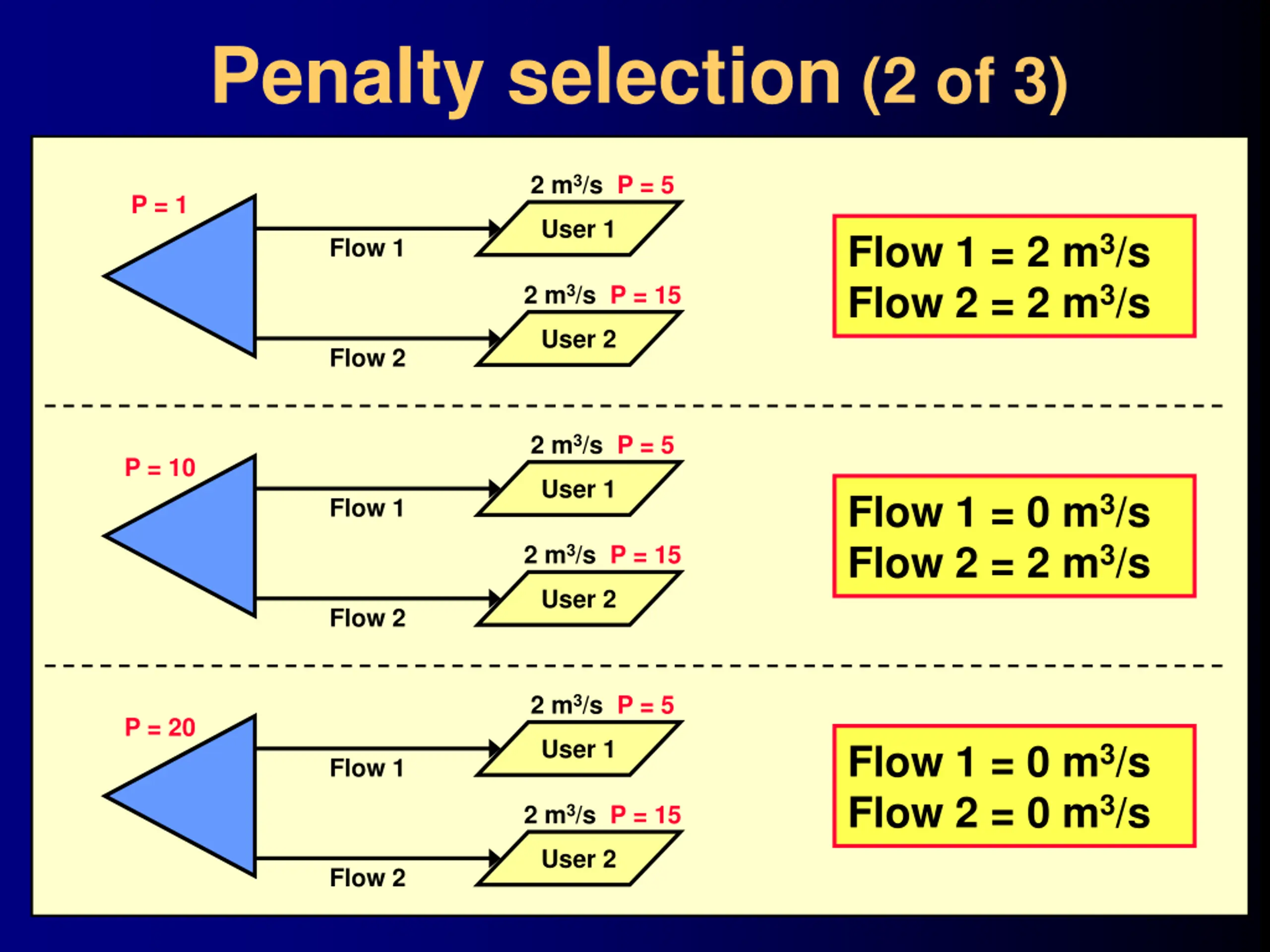 Penalty selection (2 of 3) 2 m3/s P = 5 P = 1 User 1 Flow 1 = 2 m3/s Flow 2 = 2m3/s Flow 1 2 m3/s P = 15 User 2 Flow 2 2 m3/s P = 5 P = 10 User 1 Flow 1 = 0 m3/s Flow 2 = 2m3/s Flow 1 2 m3/s P = 15 User 2 Flow 2 2 m3/s P = 5 P = 20 User 1 Flow 1 = 0 m3/s Flow 2 = 0m3/s Flow 1 2 m3/s P = 15 User 2 Flow 2