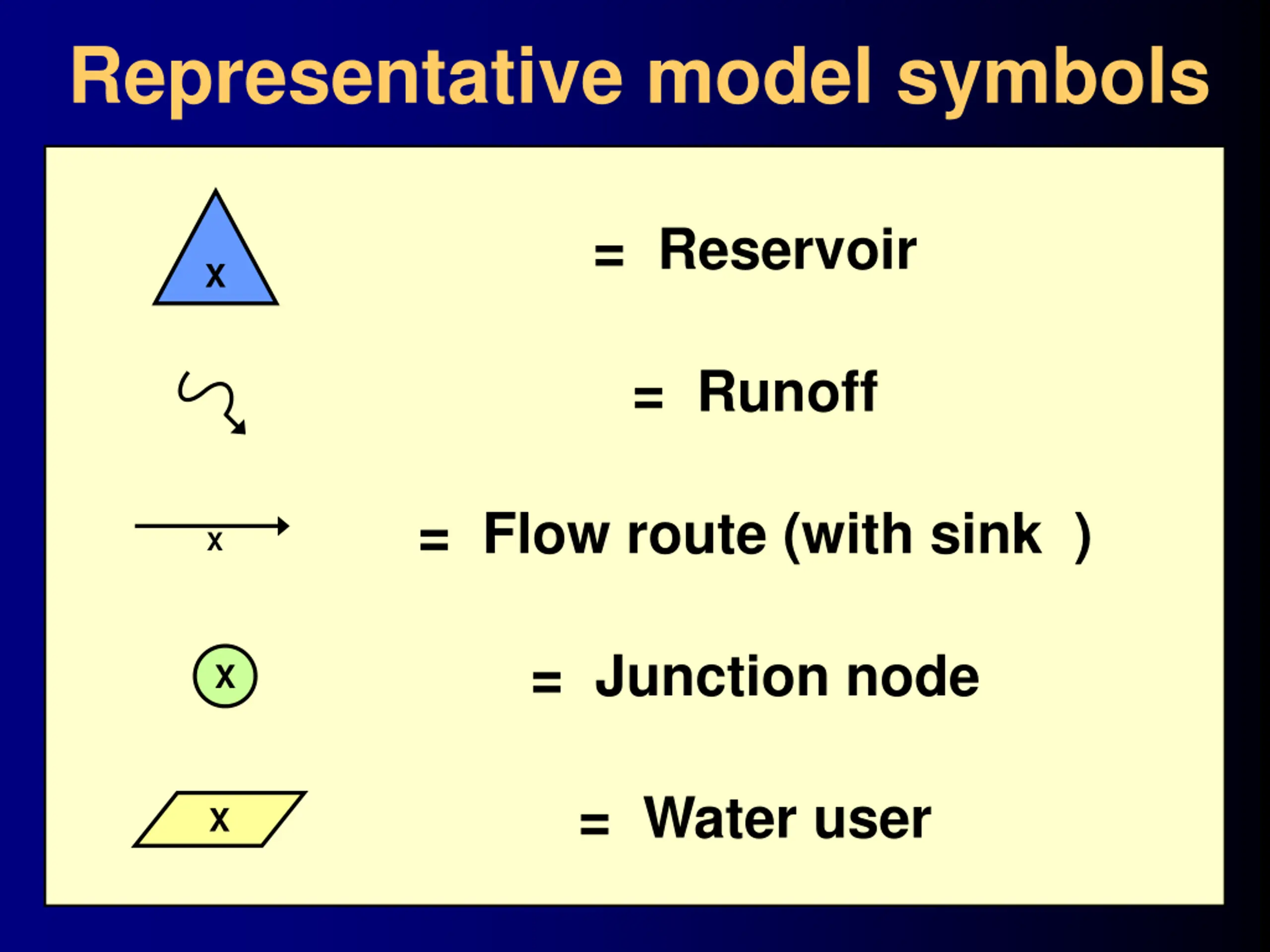 Representative model symbols = Reservoir X = Runoff = Flow route (with sink ) X = Junction node X = Water user X