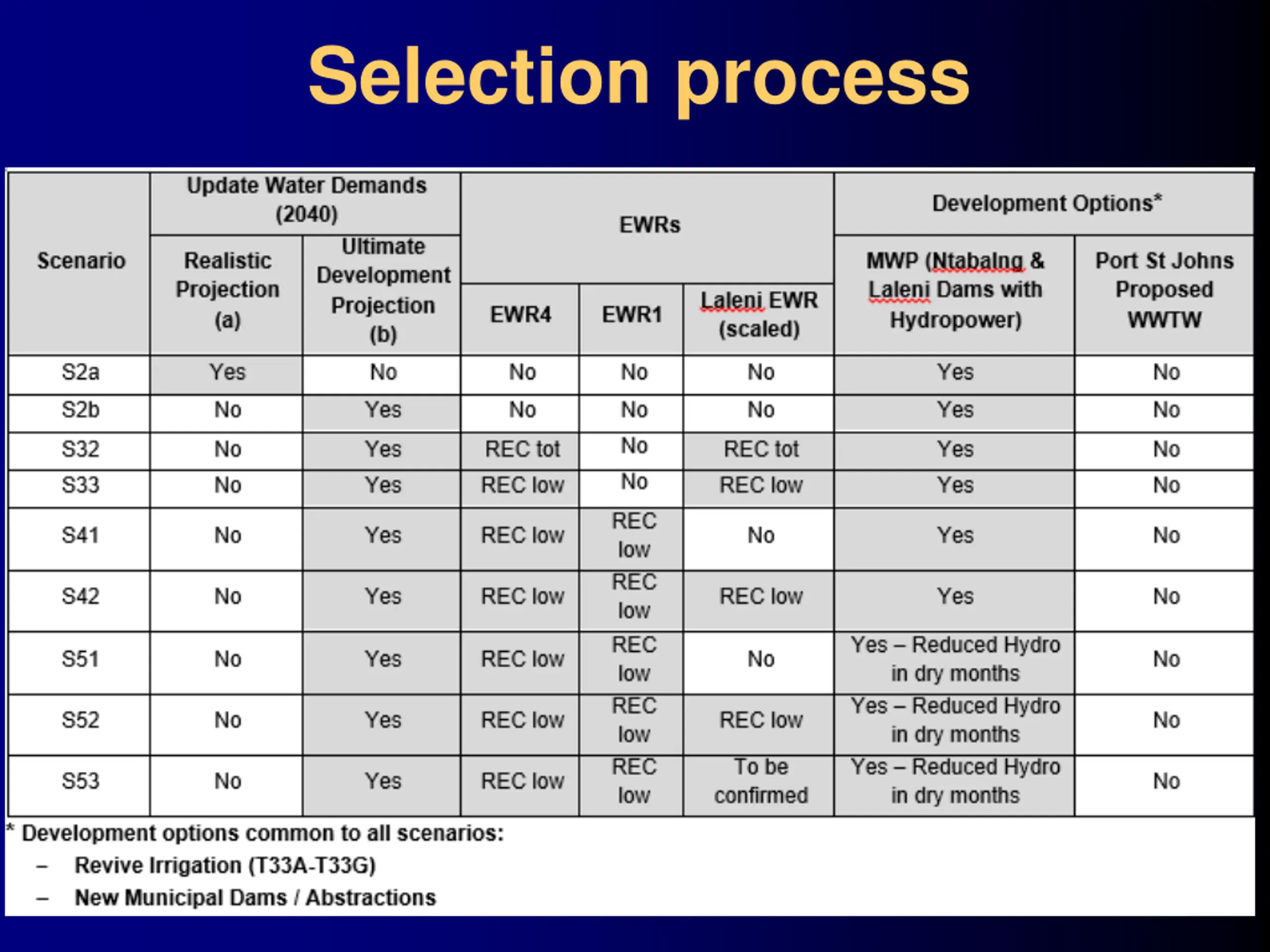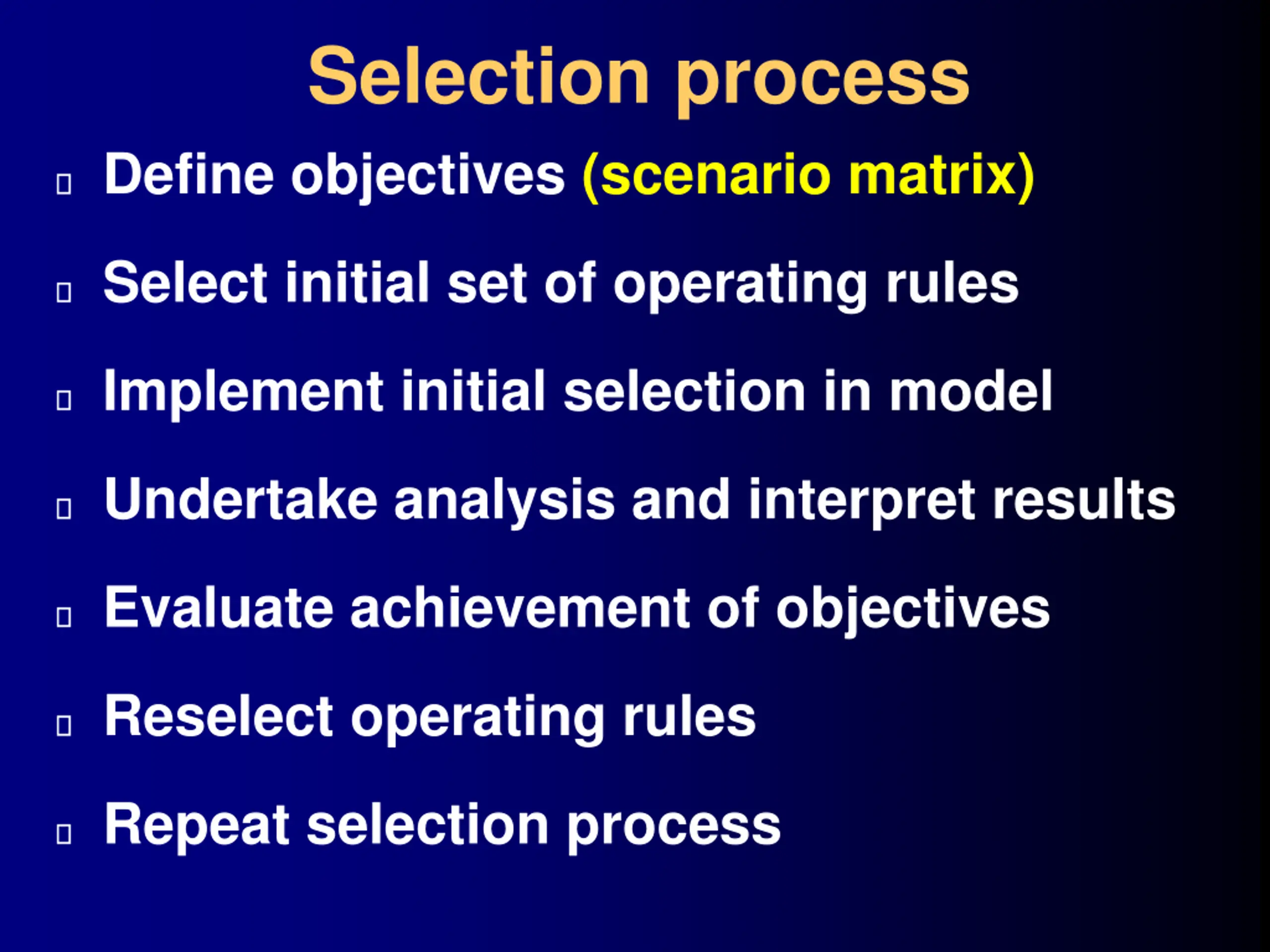 Selection process Define objectives (scenario matrix) Select initial set of operating rules Implement initial selection in model Undertake analysis and interpret results Evaluate achievement of objectives Reselect operating rules Repeat selection process