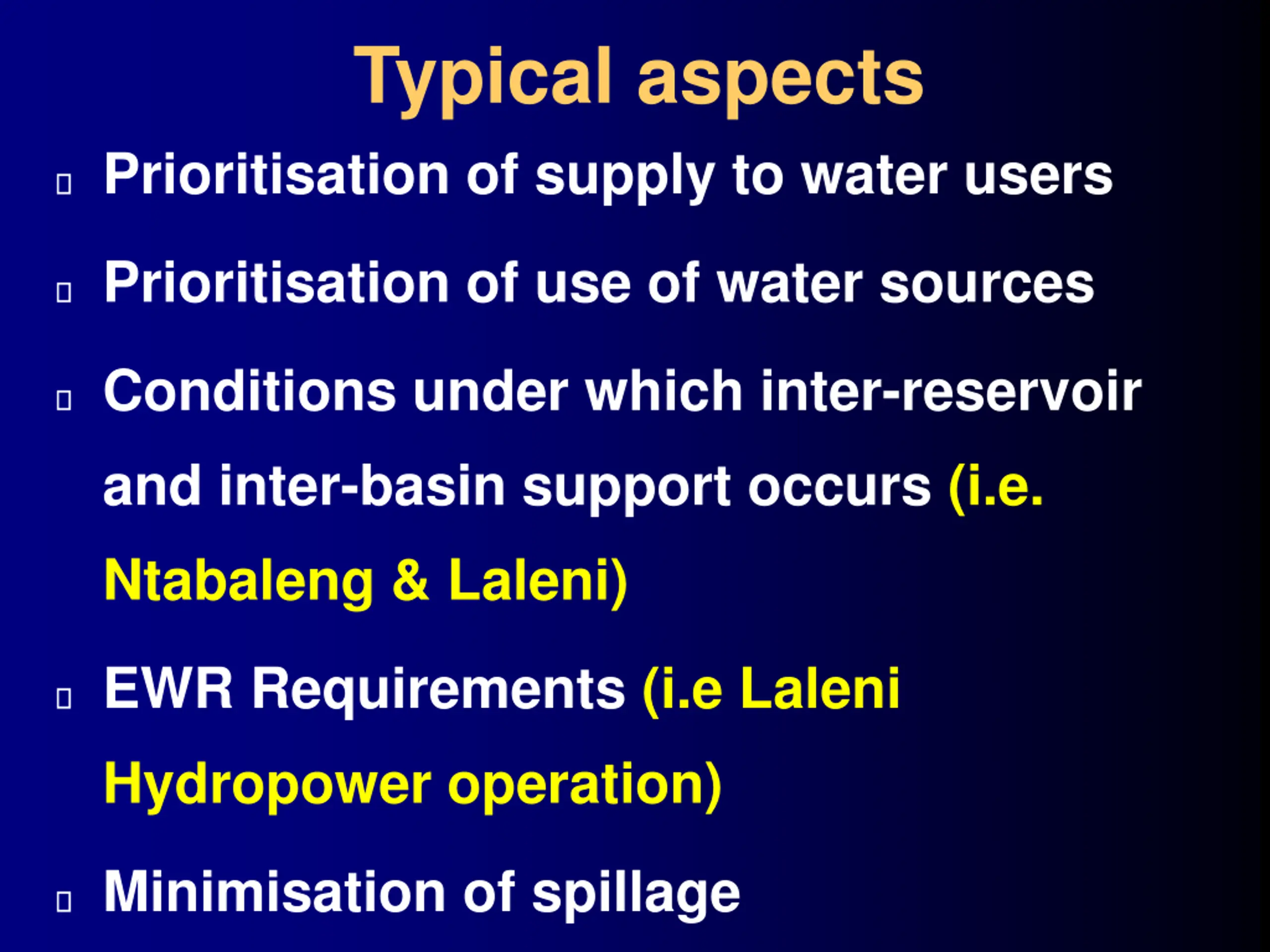 Typical aspects Prioritisation of supply to water users Prioritisation of use of water sources Conditions under which inter-reservoir and inter-basin support occurs (i.e. Ntabaleng & Laleni) EWR Requirements (i.e Laleni Hydropower operation) Minimisation of spillage