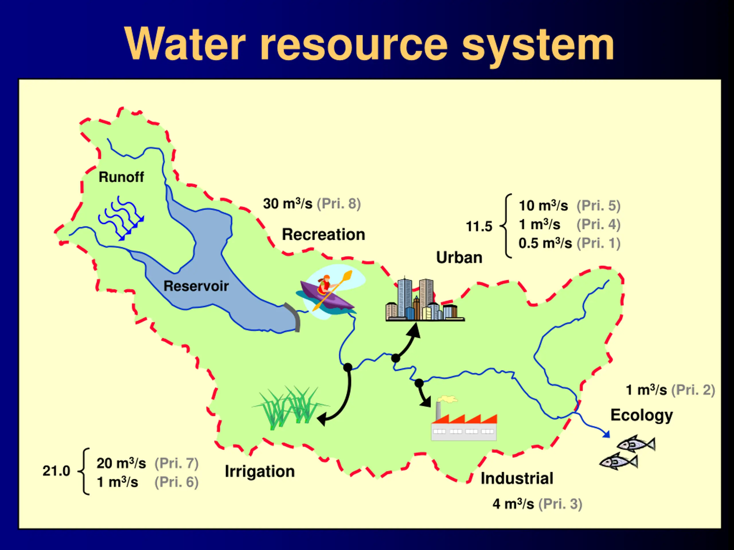 Water resource system Runoff 30 m3/s (Pri. 8) 10 m3/s 1 m3/s 0.5 m3/s (Pri. 5) (Pri. 4) (Pri. 1) 11.5 Recreation Urban Reservoir 1 m3/s (Pri. 2) Ecology 20 m3/s 1 m3/s (Pri. 7) (Pri. 6) Irrigation 21.0 Industrial 4 m3/s (Pri. 3)
