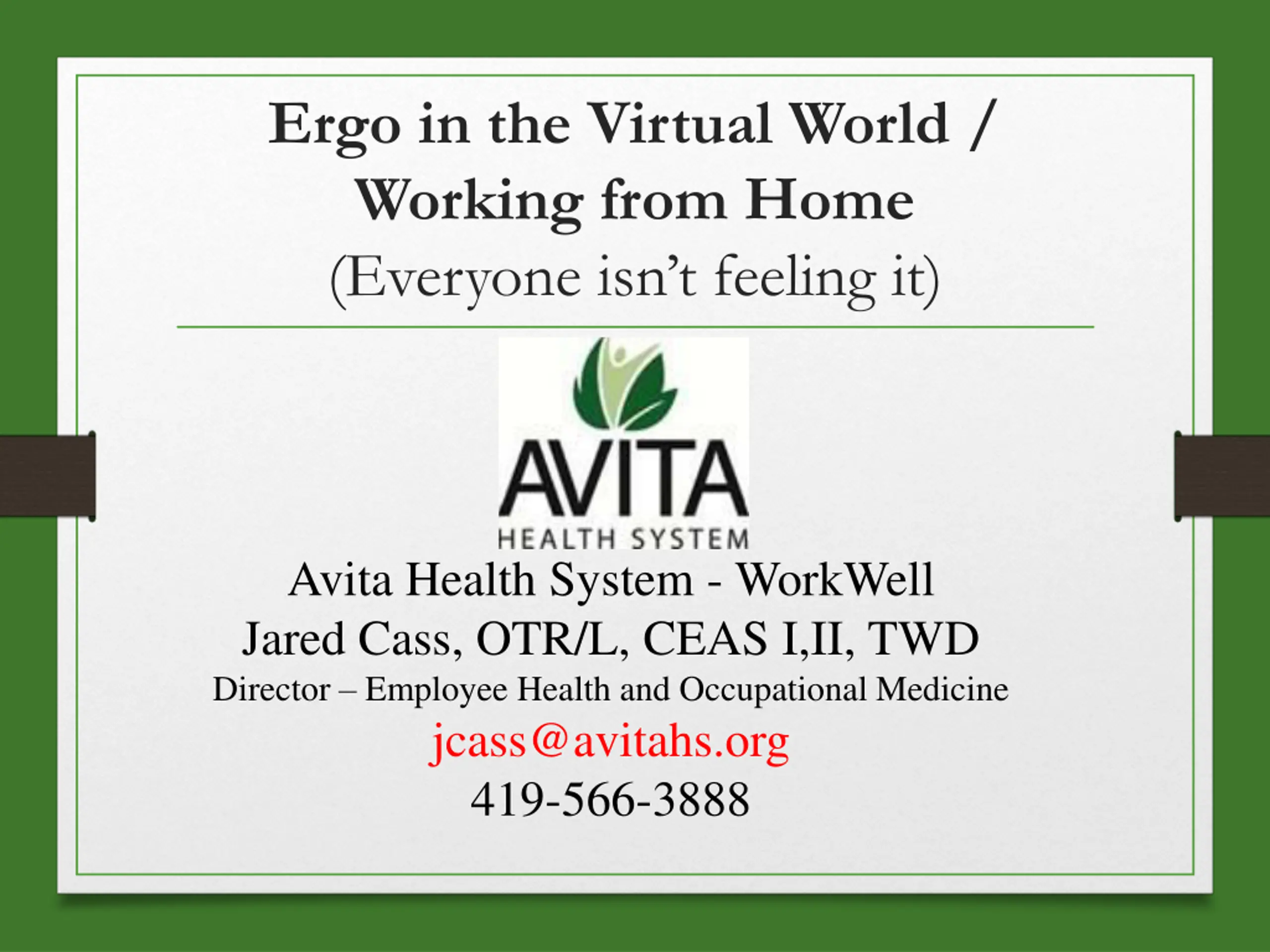 Ergo in the Virtual World / Working from Home (Everyone isn t feeling it) AVITA Health Systems Logo_400 Avita Health System - WorkWell Jared Cass, OTR/L, CEAS I,II, TWD Director Employee Health and Occupational Medicine jcass@avitahs.org 419-566-3888