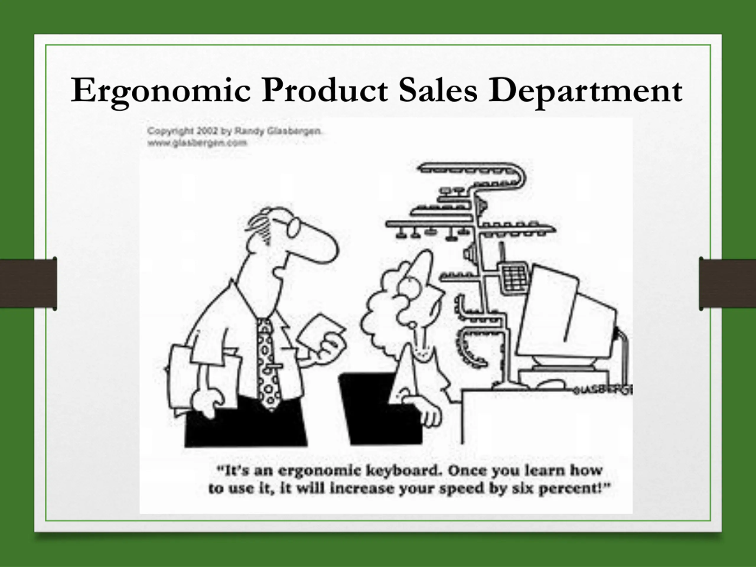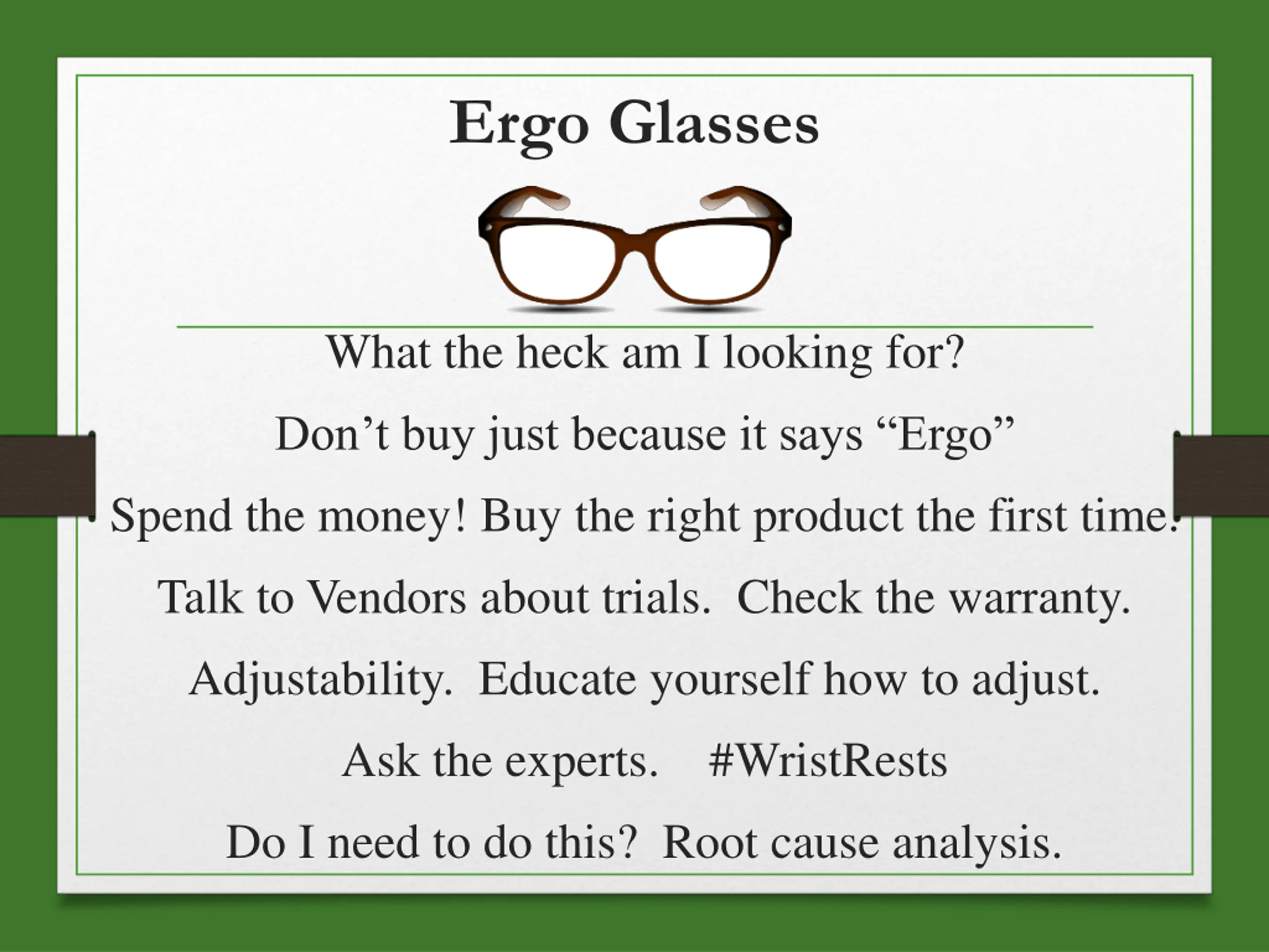Ergo Glasses What the heck am I looking for? Don t buy just because it says Ergo Spend the money! Buy the right product the first time. Talk to Vendors about trials. Check the warranty. Adjustability. Educate yourself how to adjust. Ask the experts. #WristRests Do I need to do this? Root cause analysis.