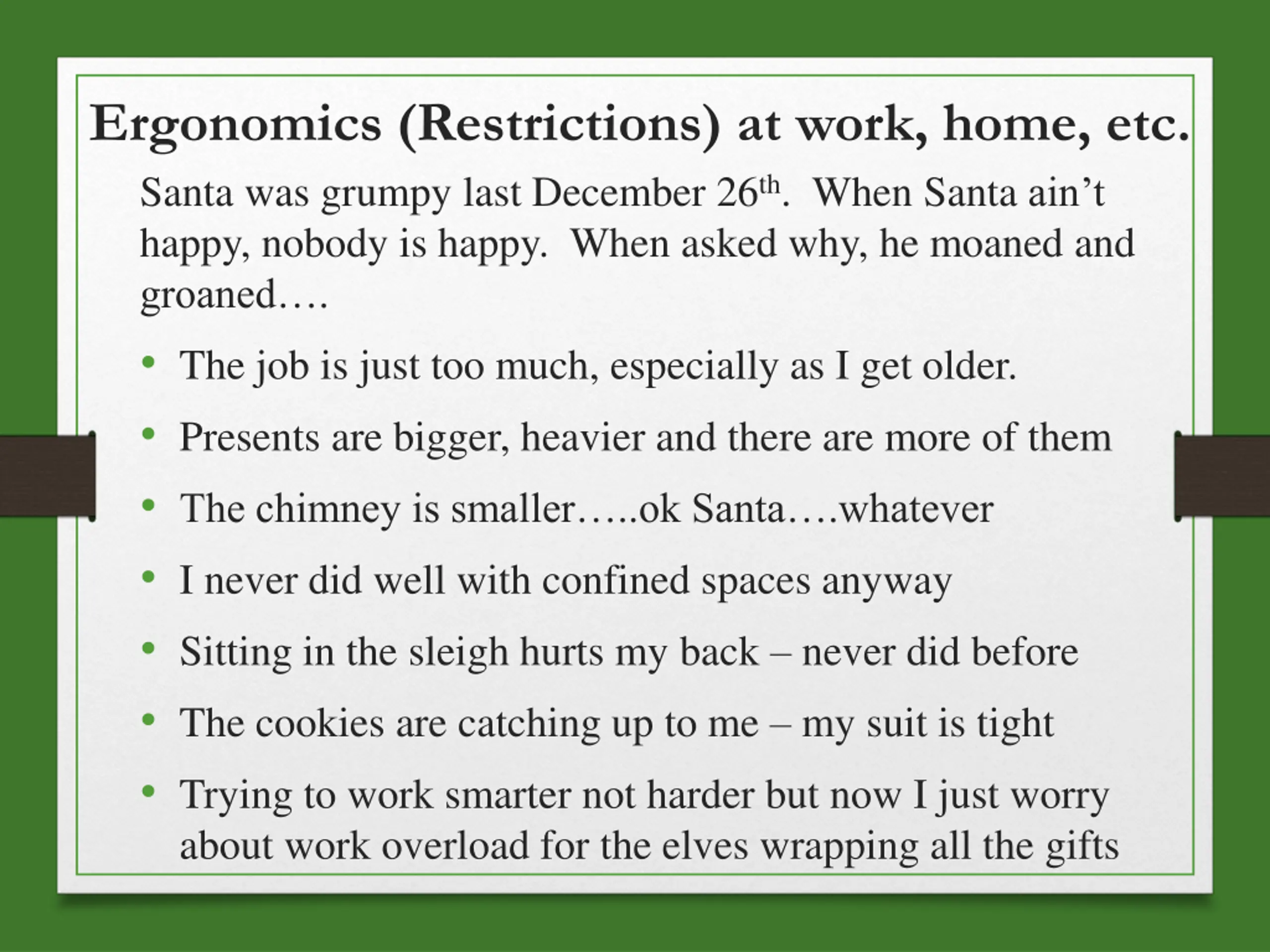 Ergonomics (Restrictions) at work, home, etc. Santa was grumpy last December 26th. When Santa ain t happy, nobody is happy. When asked why, he moaned and groaned . The job is just too much, especially as I get older. Presents are bigger, heavier and there are more of them The chimney is smaller ..ok Santa .whatever I never did well with confined spaces anyway Sitting in the sleigh hurts my back never did before The cookies are catching up to me my suit is tight Trying to work smarter not harder but now I just worry about work overload for the elves wrapping all the gifts
