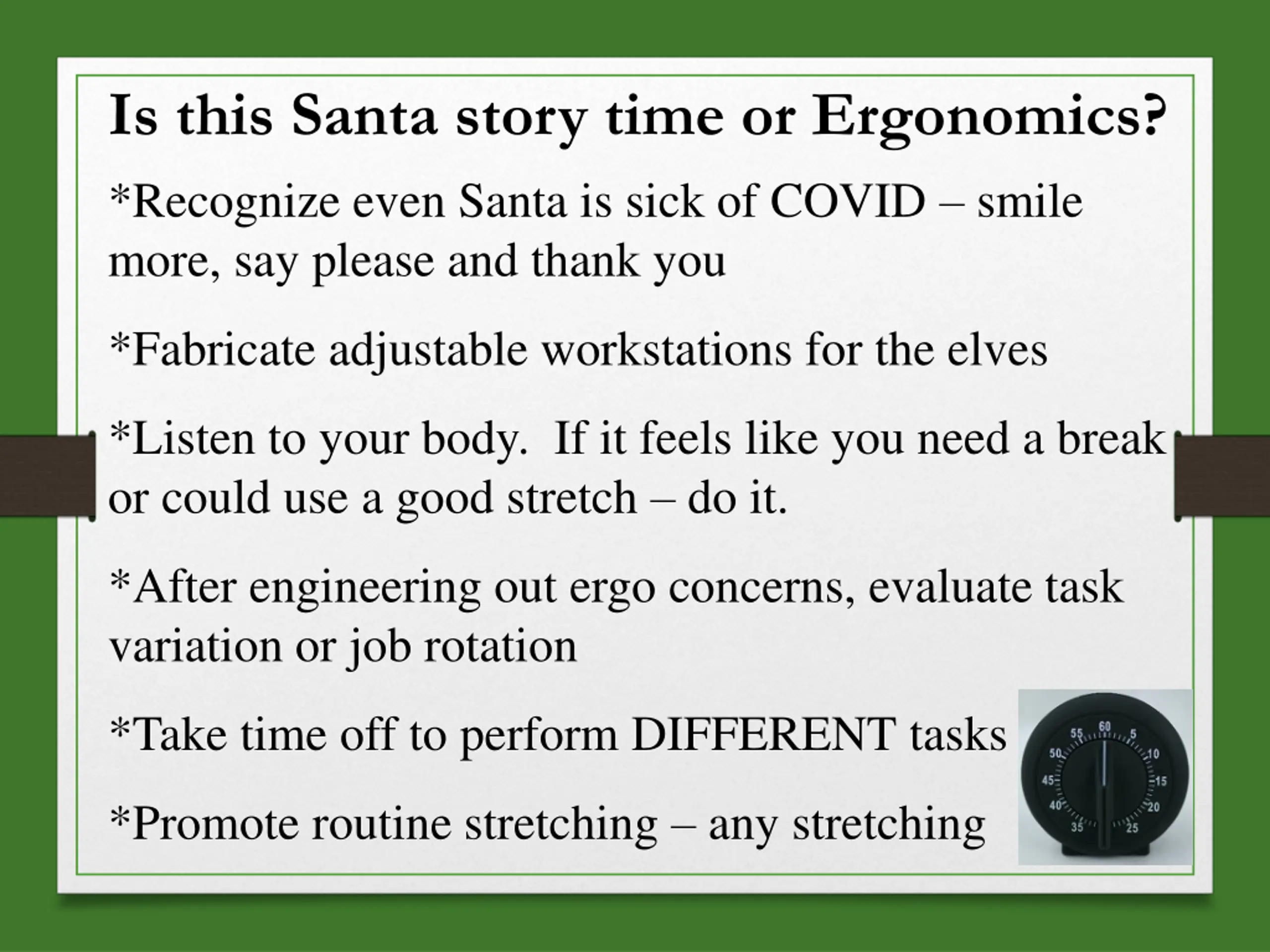 Is this Santa story time or Ergonomics? *Recognize even Santa is sick of COVID smile more, say please and thank you *Fabricate adjustable workstations for the elves *Listen to your body. If it feels like you need a break or could use a good stretch do it. *After engineering out ergo concerns, evaluate task variation or job rotation *Take time off to perform DIFFERENT tasks *Promote routine stretching any stretching