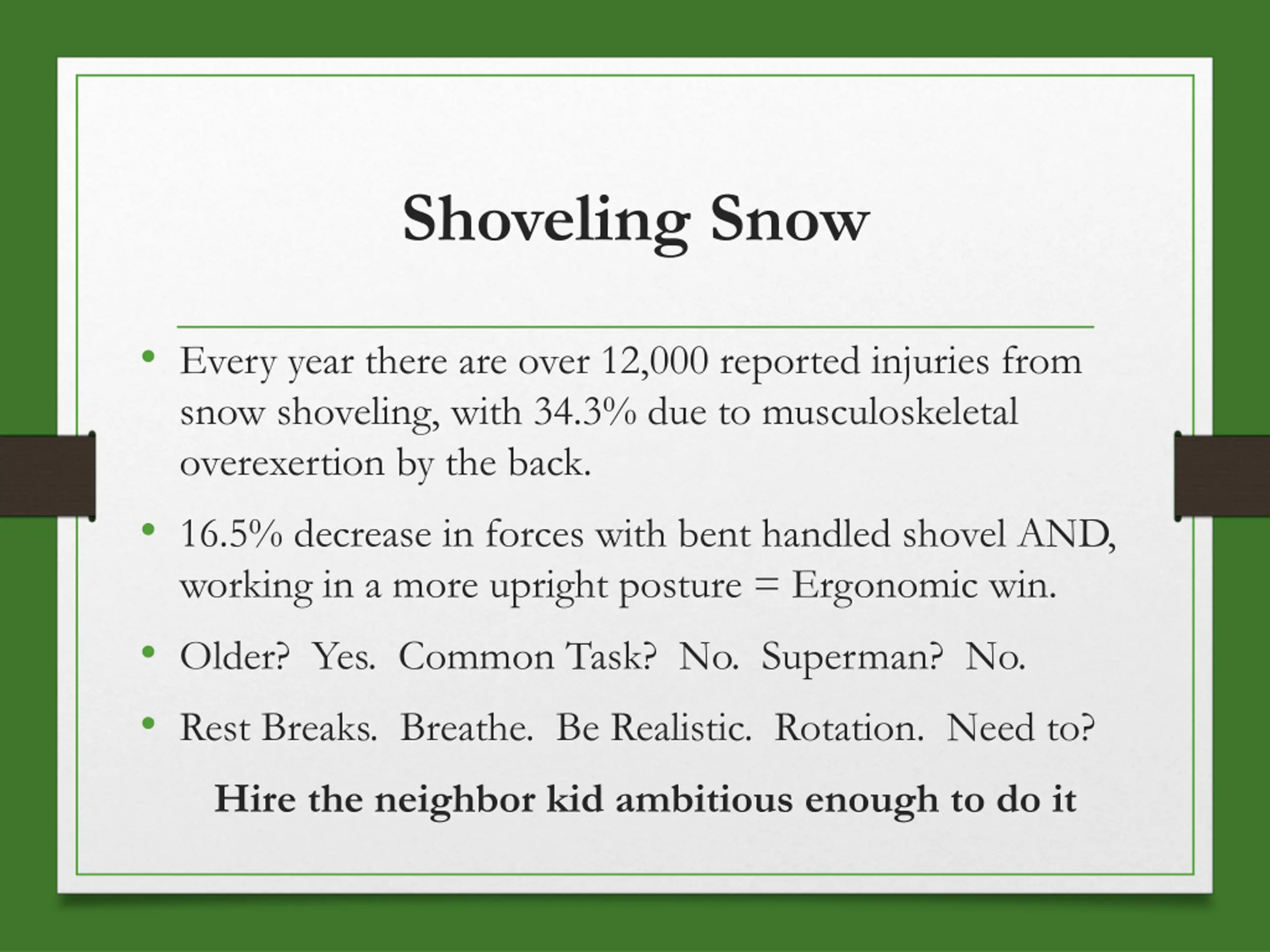 Shoveling Snow Every year there are over 12,000 reported injuries from snow shoveling, with 34.3% due to musculoskeletal overexertion by the back. 16.5% decrease in forces with bent handled shovel AND, working in a more upright posture = Ergonomic win. Older? Yes. Common Task? No. Superman? No. Rest Breaks. Breathe. Be Realistic. Rotation. Need to? Hire the neighbor kid ambitious enough to do it