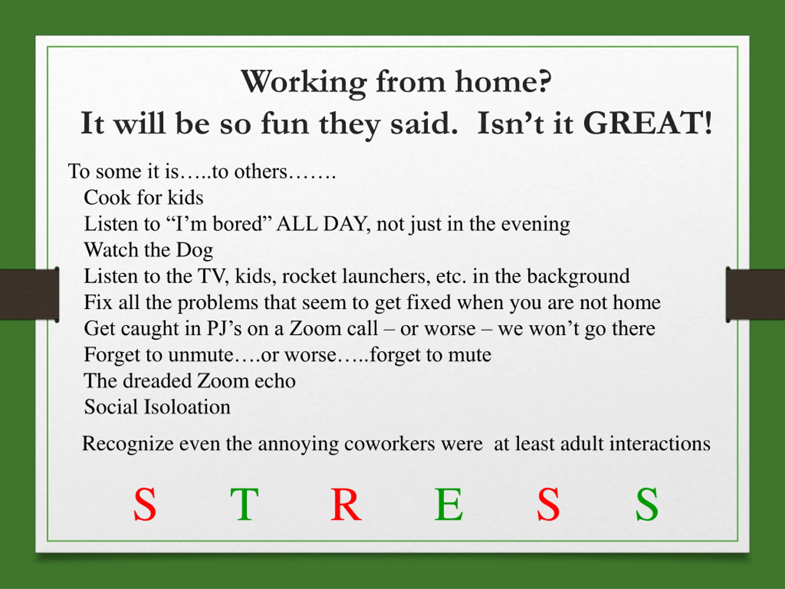 Working from home? It will be so fun they said. Isn t it GREAT! To some it is ..to others . Cook for kids Listen to I m bored ALL DAY, not just in the evening Watch the Dog Listen to the TV, kids, rocket launchers, etc. in the background Fix all the problems that seem to get fixed when you are not home Get caught in PJ s on a Zoom call or worse we won t go there Forget to unmute .or worse ..forget to mute The dreaded Zoom echo Social Isoloation Recognize even the annoying coworkers were at least adult interactions S T R E S S