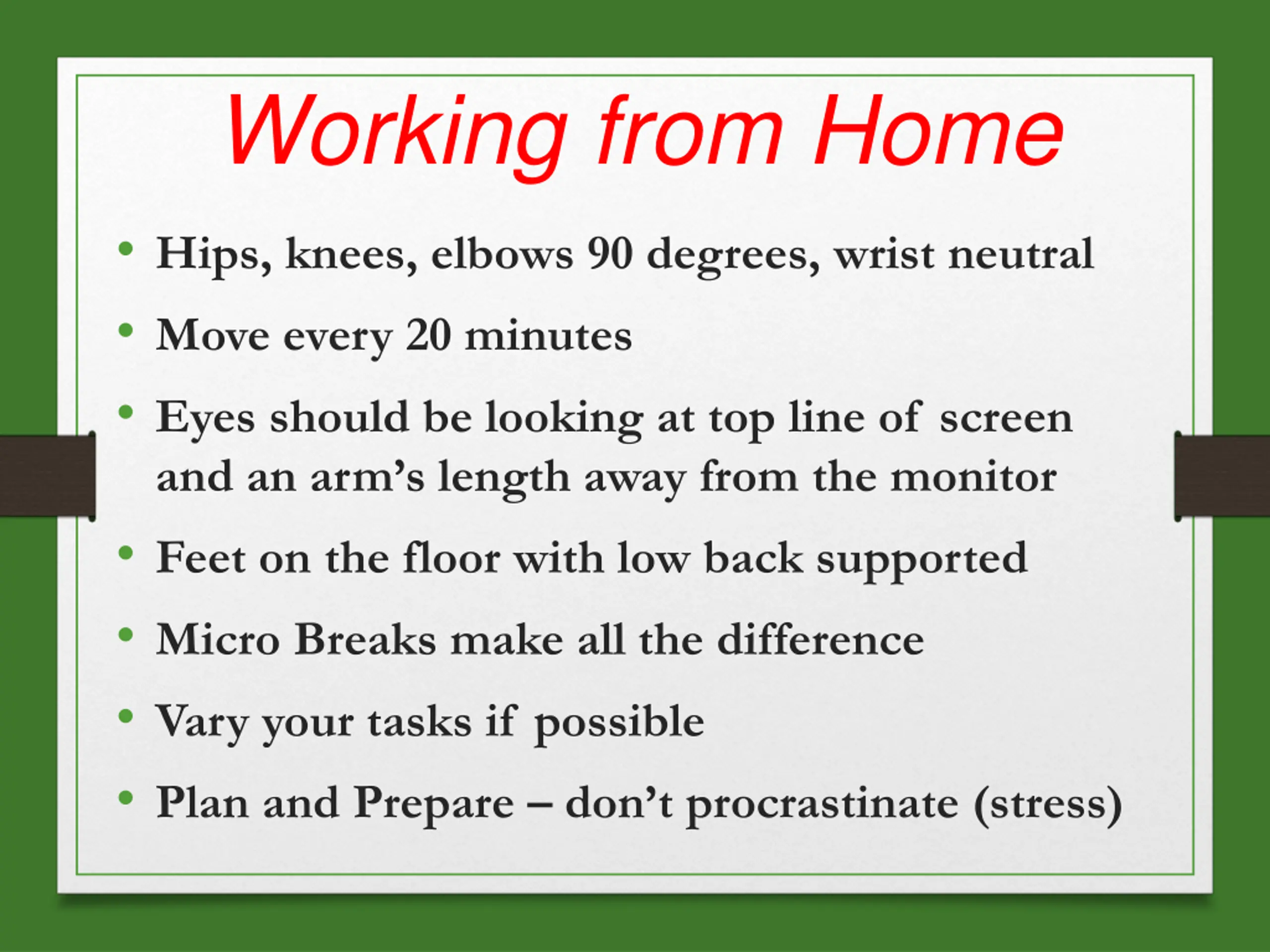 Working from Home Hips, knees, elbows 90 degrees, wrist neutral Move every 20 minutes Eyes should be looking at top line of screen and an arm s length away from the monitor Feet on the floor with low back supported Micro Breaks make all the difference Vary your tasks if possible Plan and Prepare don t procrastinate (stress)