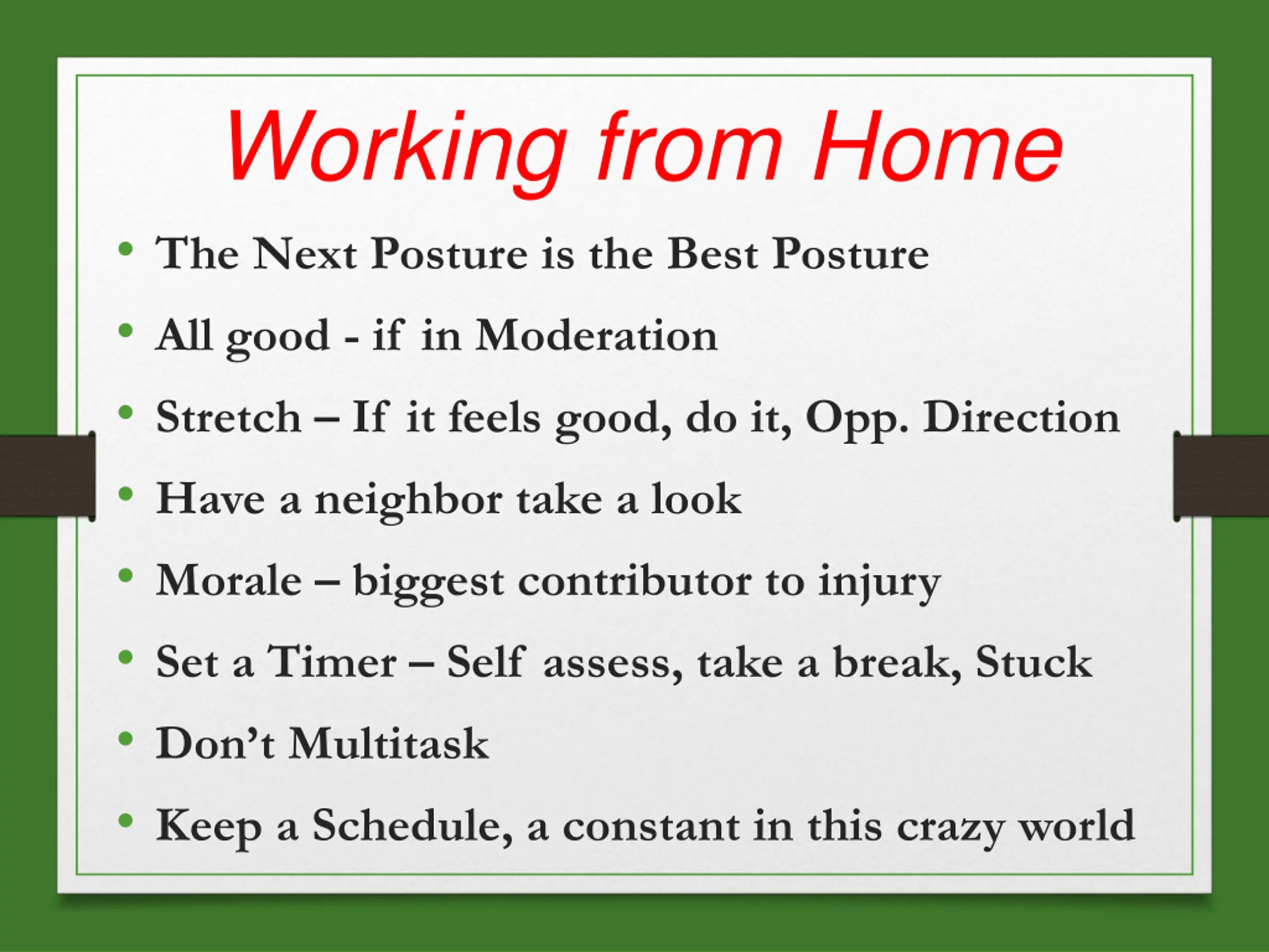 Working from Home The Next Posture is the Best Posture All good - if in Moderation Stretch If it feels good, do it, Opp. Direction Have a neighbor take a look Morale biggest contributor to injury Set a Timer Self assess, take a break, Stuck Don t Multitask Keep a Schedule, a constant in this crazy world
