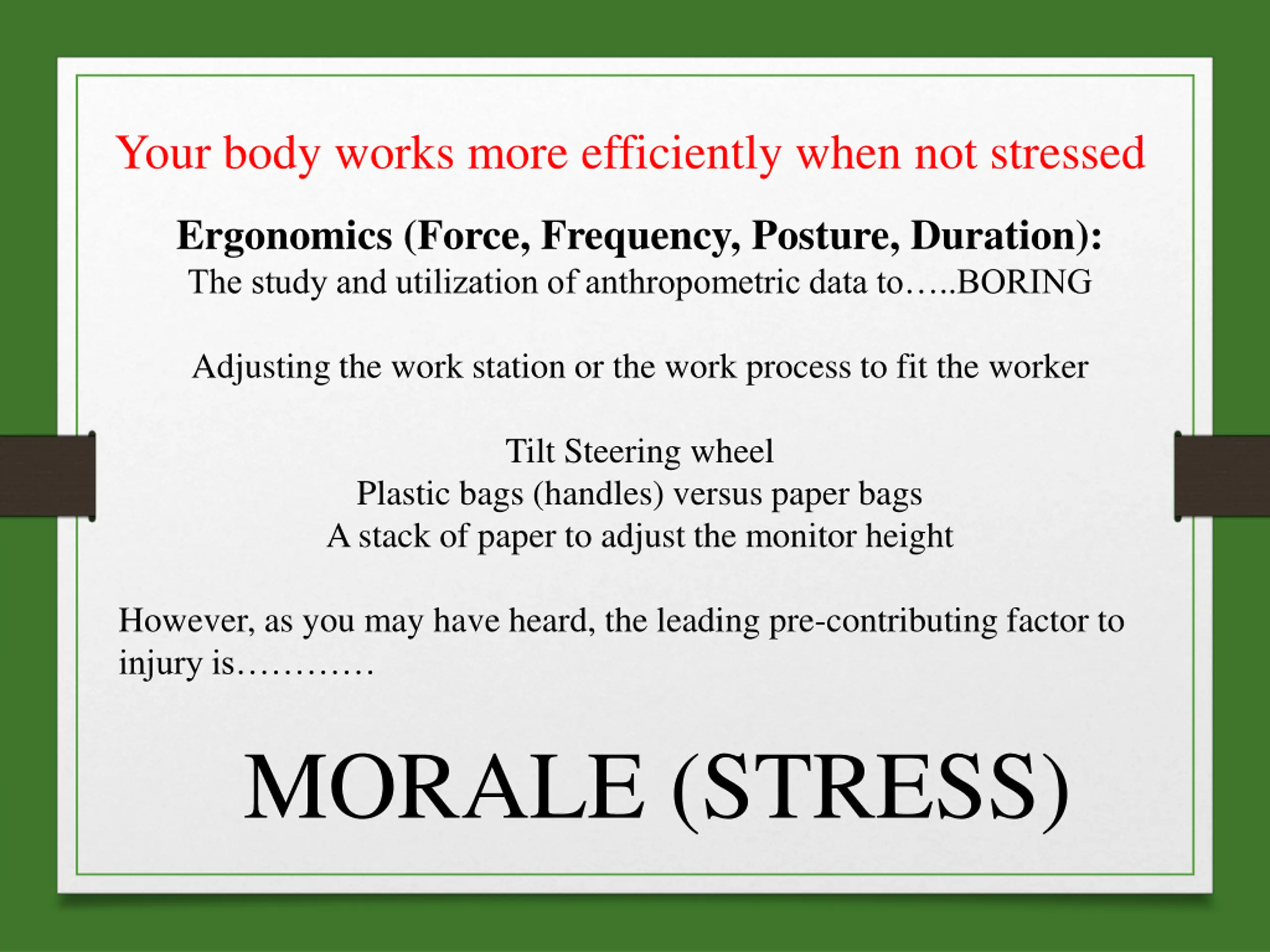 Your body works more efficiently when not stressed Ergonomics (Force, Frequency, Posture, Duration): The study and utilization of anthropometric data to ..BORING Adjusting the work station or the work process to fit the worker Tilt Steering wheel Plastic bags (handles) versus paper bags A stack of paper to adjust the monitor height However, as you may have heard, the leading pre-contributing factor to injury is MORALE (STRESS)