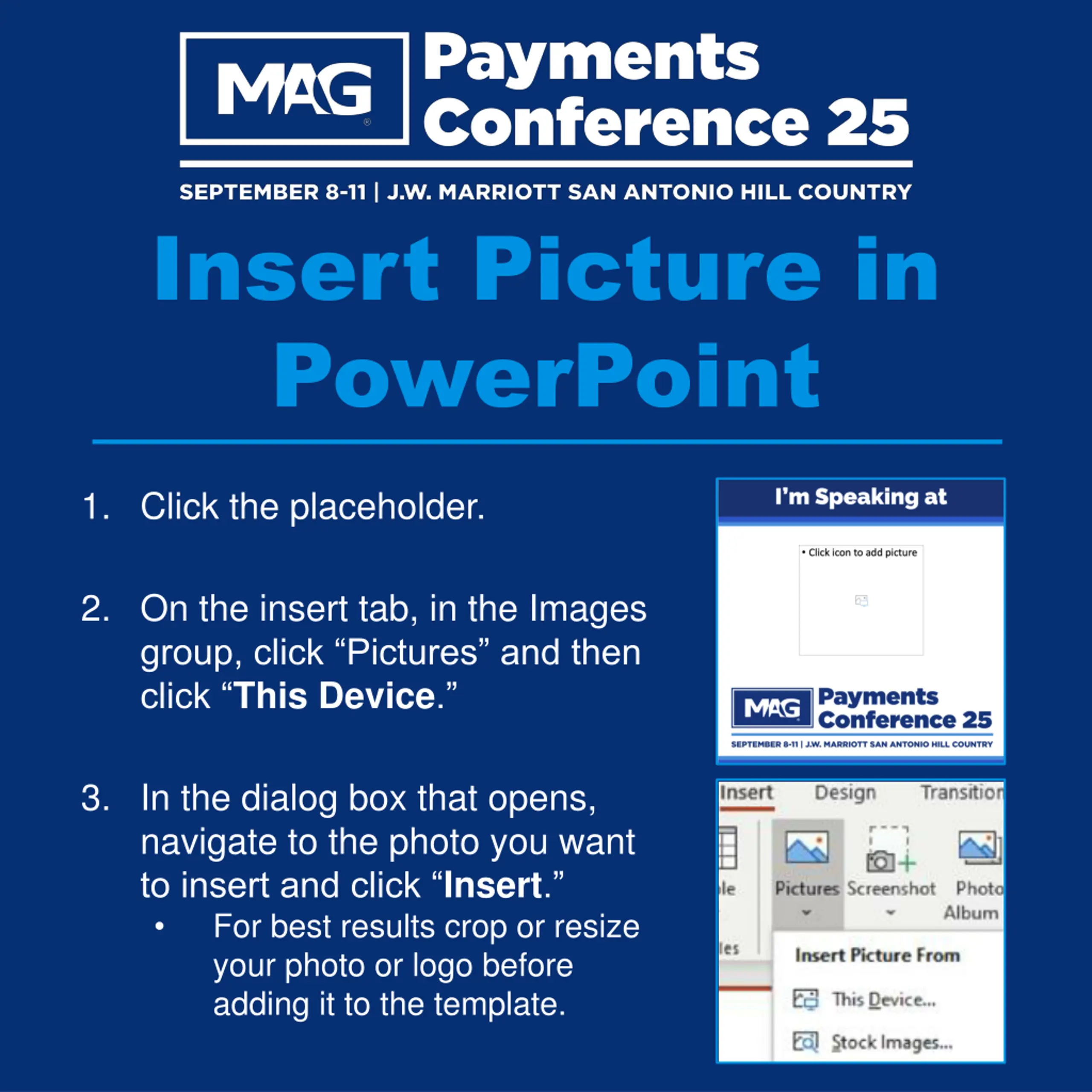 Insert Picture in PowerPoint 1. Click the placeholder. 2. On the insert tab, in the Images group, click Pictures and then click This Device. 3. In the dialog box that opens, navigate to the photo you want to insert and click Insert. For best results crop or resize your photo or logo before adding it to the template.
