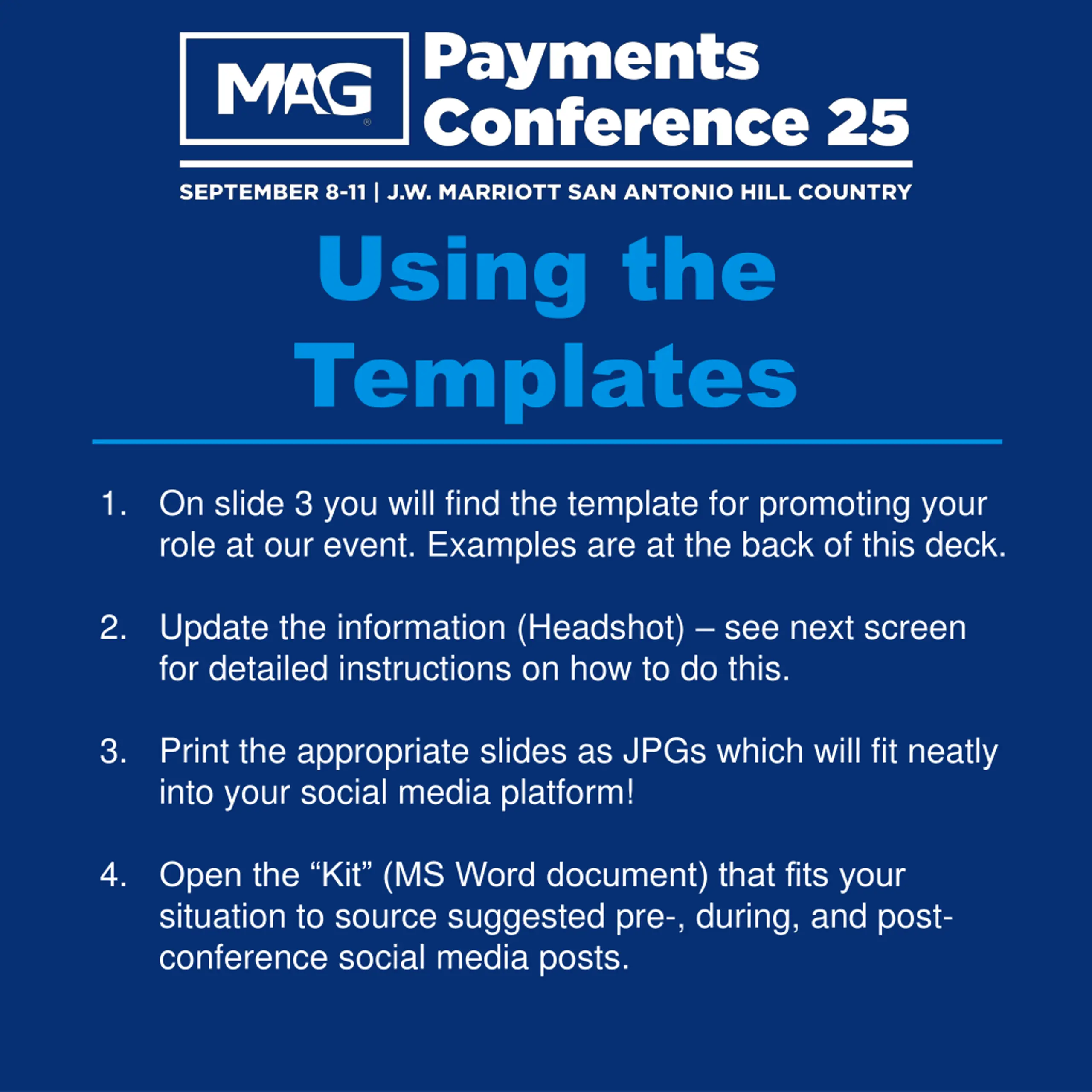 Enhance your social media impact for the upcoming MAG Payments Conference by utilizing templates, updating information, and sharing pre-, during-, and post-conference posts. Find detailed instructions and promotional content in this guide.