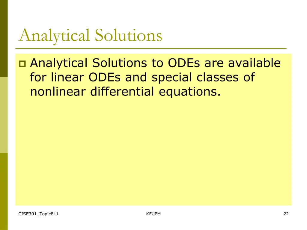 Analytical Solutions Analytical Solutions to ODEs are available for linear ODEs and special classes of nonlinear differential equations. CISE301_Topic8L1 KFUPM 22