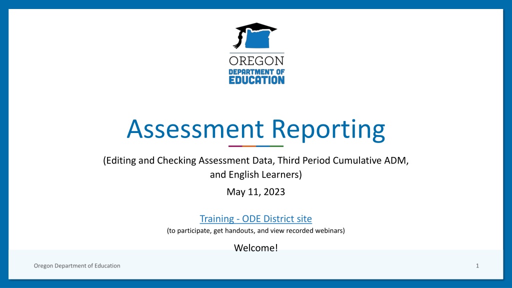 Assessment Reporting (Editing and Checking Assessment Data, Third Period Cumulative ADM, and English Learners) May 11, 2023 Training - ODE District site (to participate, get handouts, and view recorded webinars) Welcome! Oregon Department of Education 1