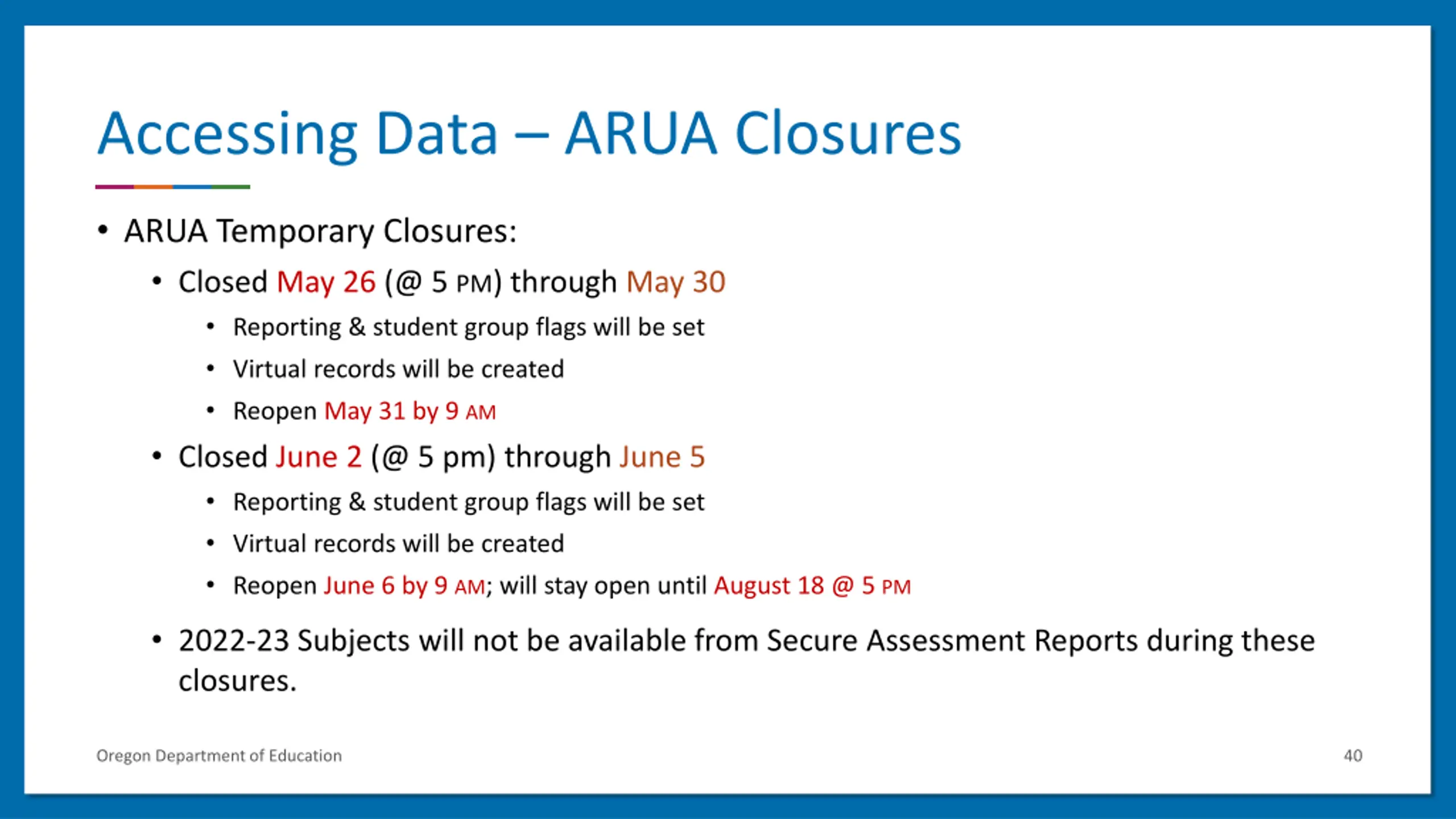 Accessing Data ARUA Closures ARUA Temporary Closures: Closed May 26 (@ 5 PM) through May 30 Reporting & student group flags will be set Virtual records will be created Reopen May 31 by 9 AM Closed June 2 (@ 5 pm) through June 5 Reporting & student group flags will be set Virtual records will be created Reopen June 6 by 9 AM; will stay open until August 18 @ 5 PM 2022-23 Subjects will not be available from Secure Assessment Reports during these closures. Oregon Department of Education 40
